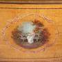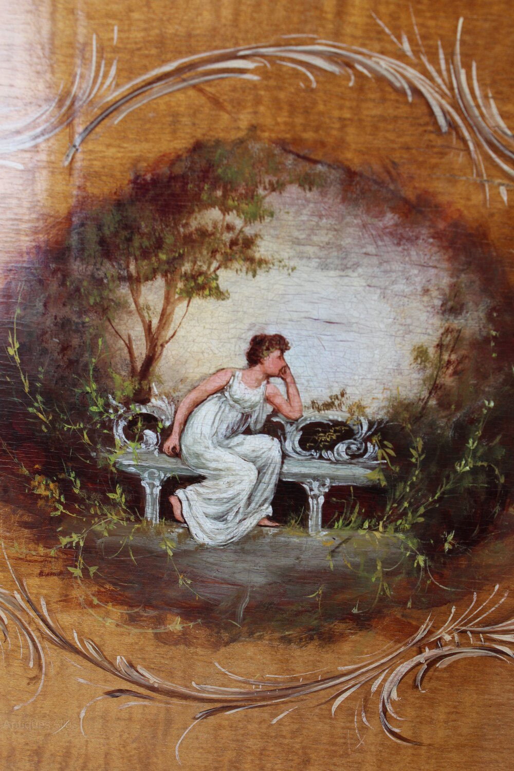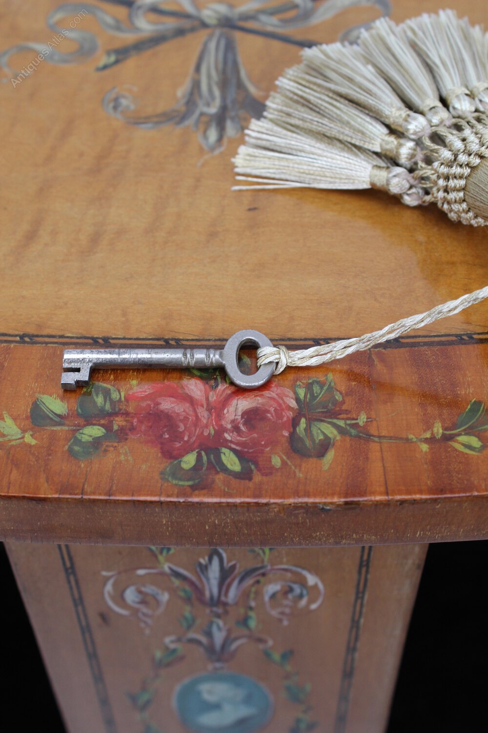 A magnificent antique Victorian satinwood inlaid and polychrome painted bow front side cabinet dating from circa 1880. The slightly over-sailing top veneered in satinwoods of excellent tone and grain, with cross-banded edges and decorated with central Puto medallion, ribbon tied floral swags and cabbage rose and wildflowers to the borders over two fielded panelled doors. The doors are cock beaded and inlaid with barber pole stringing and are beautifully decorated with two finely painted medallions depicting neo-classical romantic scenes. It stands on 4 tapered legs decorated with harebells and terminating in spade feet, the doors with working locks and key open to reveal lots of storage to the interior. This elegant cabinet is slim in shape so would work well in a hall or against a wall as a statement piece.Construction/Wood: