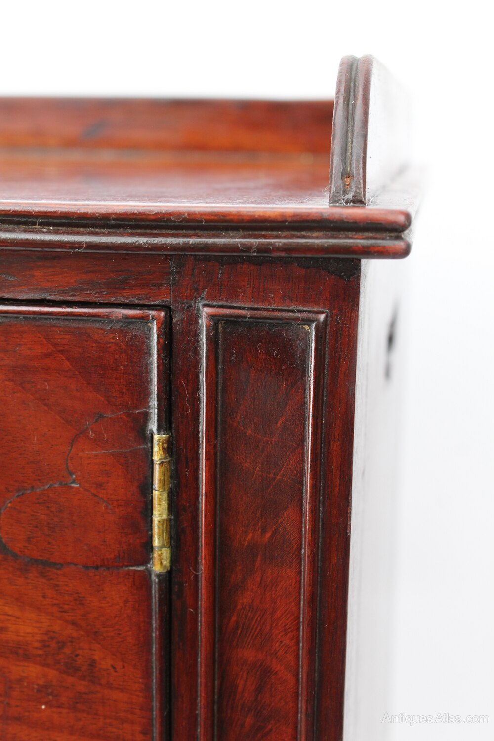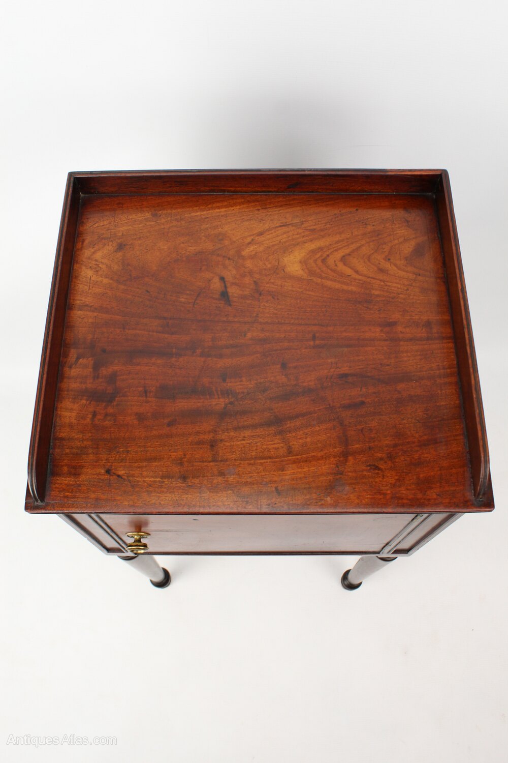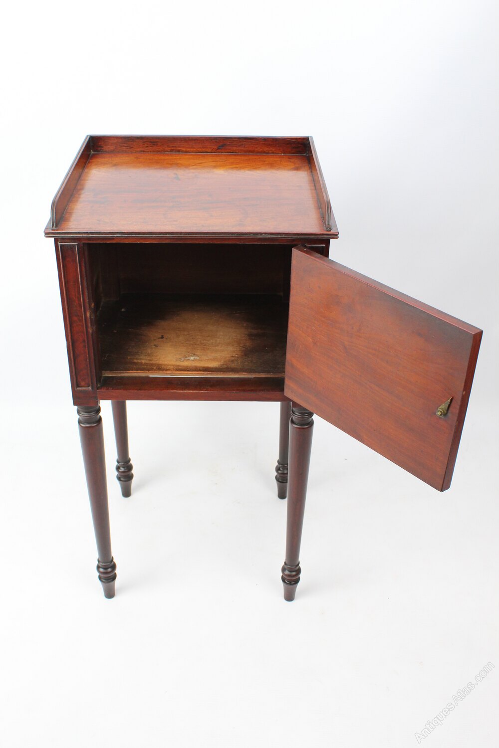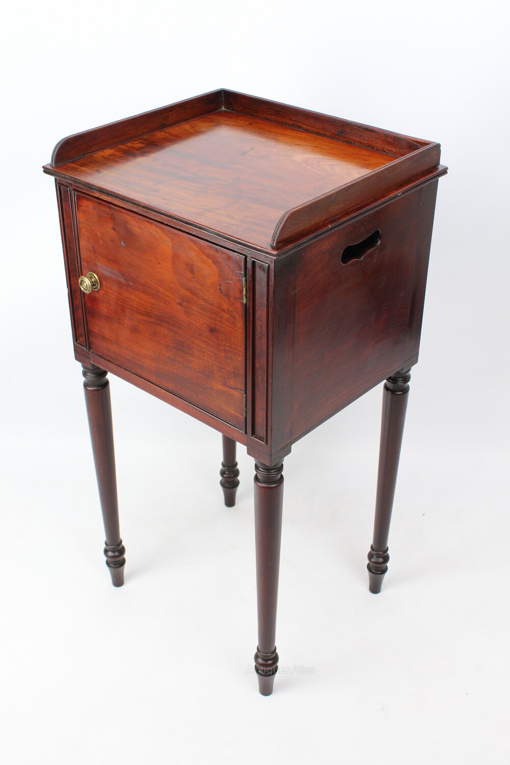 A handsome antique mahogany Regency bedside cupboard dating from circa 1820. The beautifully figured top with reeded three quarter gallery, over a figured cupboard door with brass knob. Raised on finely turned legs and with elegantly pierced carry handles. A really good-quality piece that would work equally well as a bedside cabinet as it would next to a desk or as a lamp table.Construction/Wood: