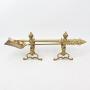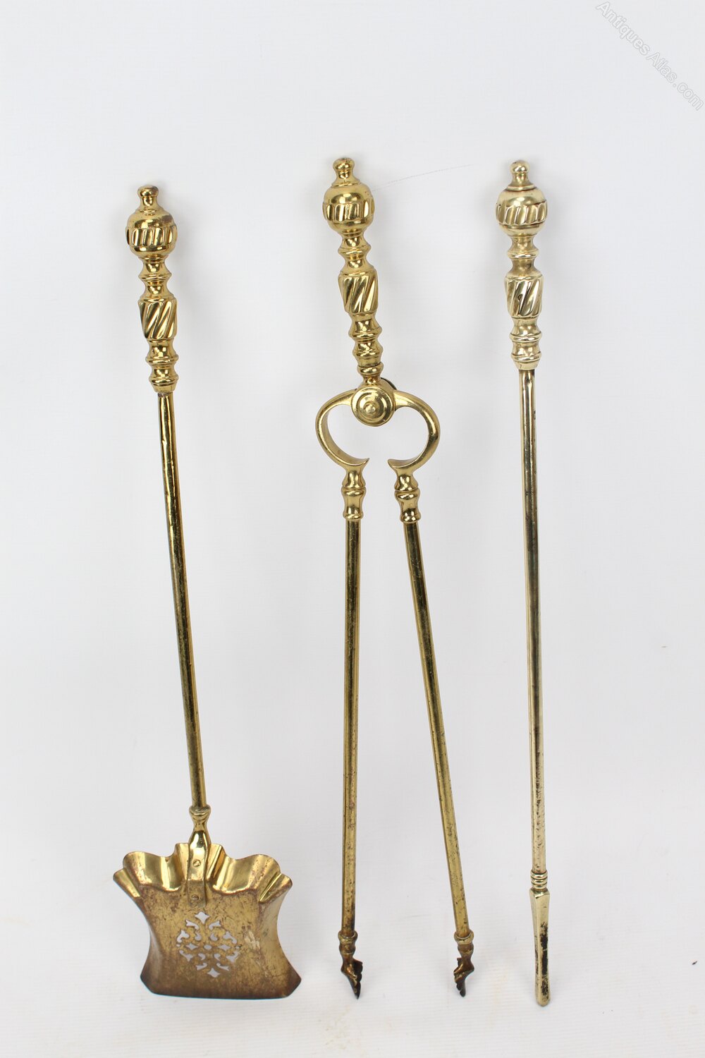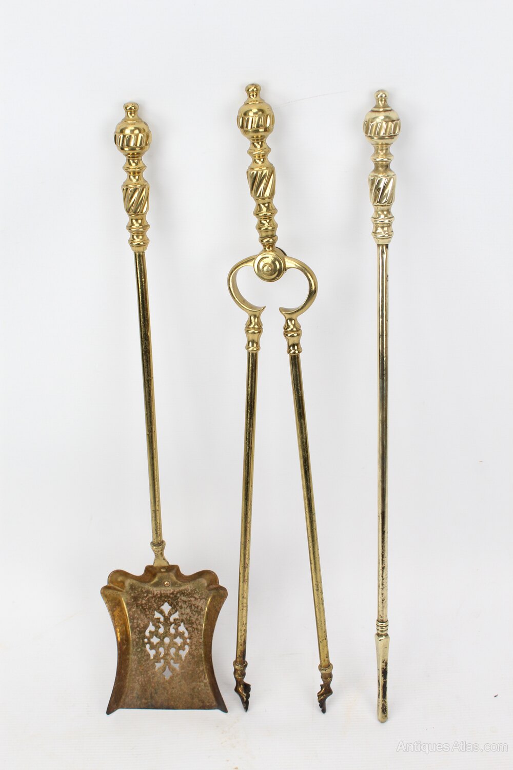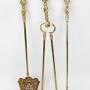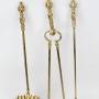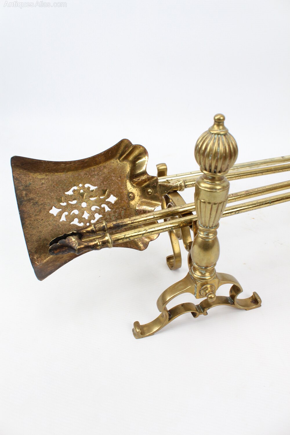 A charming set of antique Victorian brass fire tools and fire rests or fire dogs dating from circa 1885. Comprising a pair of tongs, a poker and a shovel all with fancy turned handles and attractive detailing. The dogs feature beehive globe finials with turned and fluted stems and stand on scrolled legs and are stamped with registration numbers for 1885.Construction: