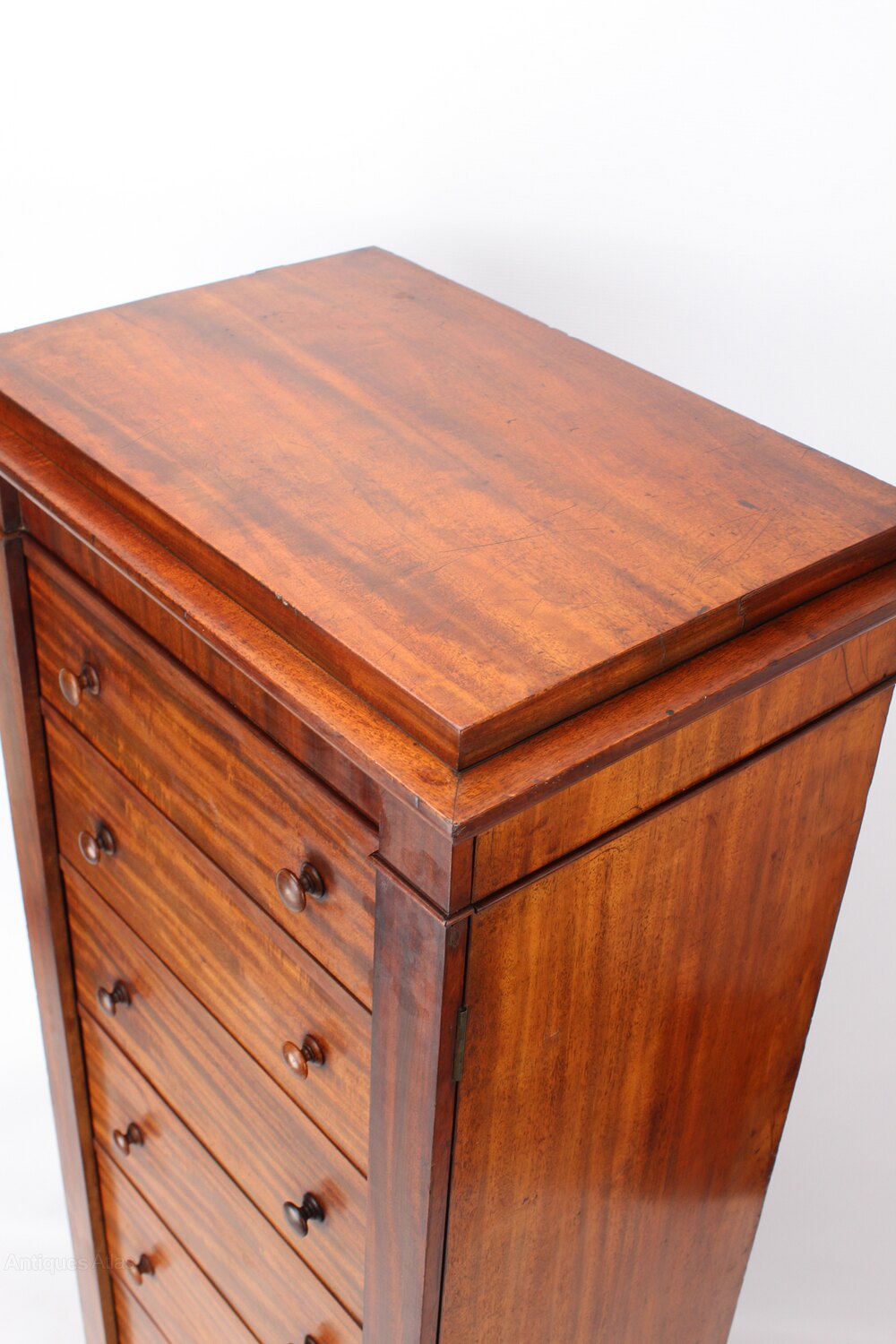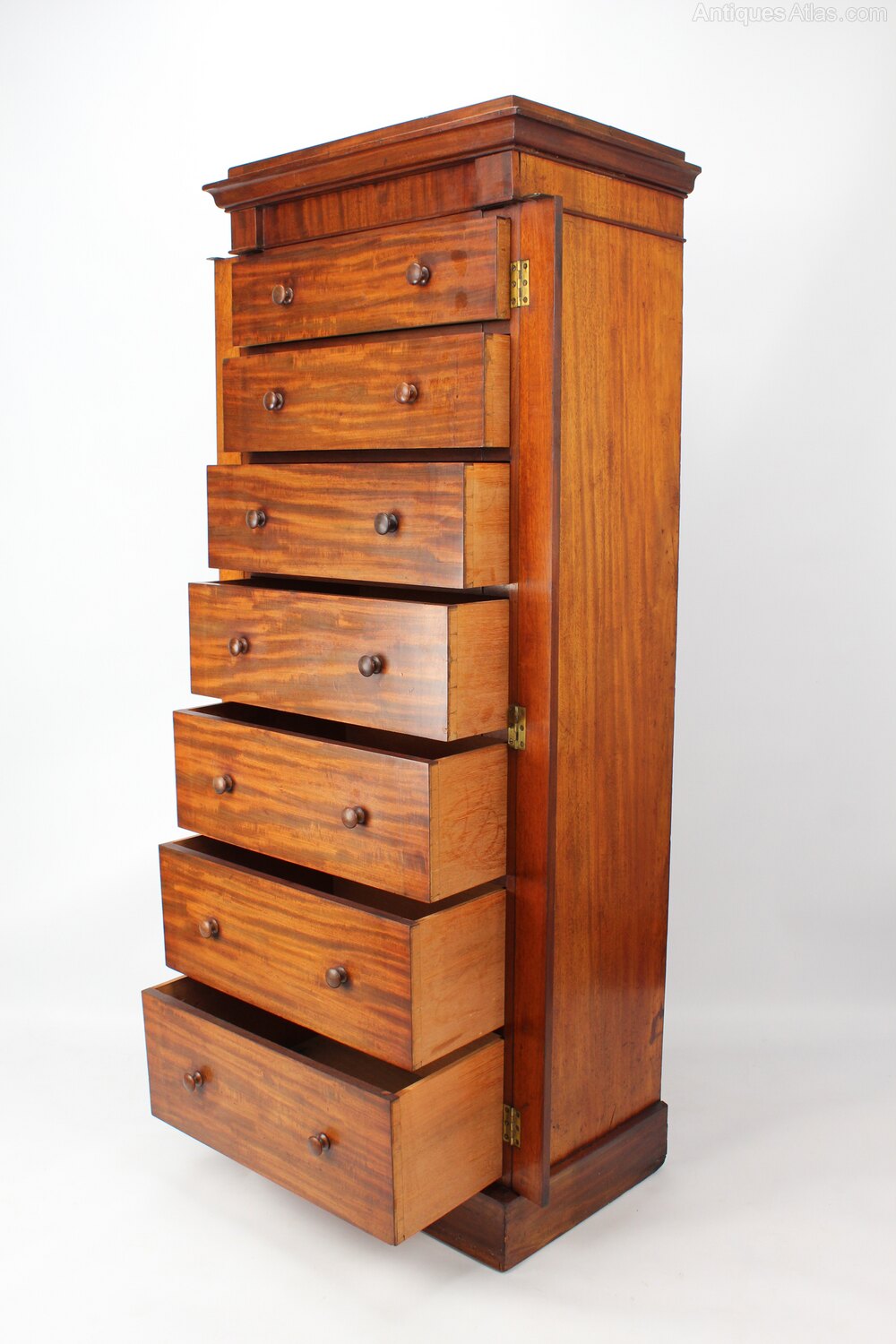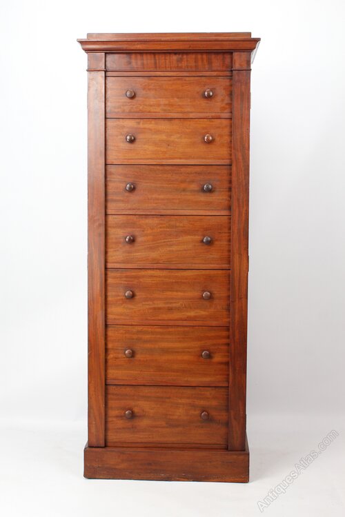A magnificent tall antique Victorian mahogany Wellington chest dating from circa 1860. In wonderfully figured mahogany veneers it features an over-sailing top above seven graduated drawers with turned handles and standing on a plinth base. The drawers are secured in place by side hinged pilasters and it has a secret locking mechanism. The top of the right pilaster slides open to reveal a catch which locks the drawers and then sides back to hide the catch. There is also a hidden keyhole but no key.Construction/Wood: