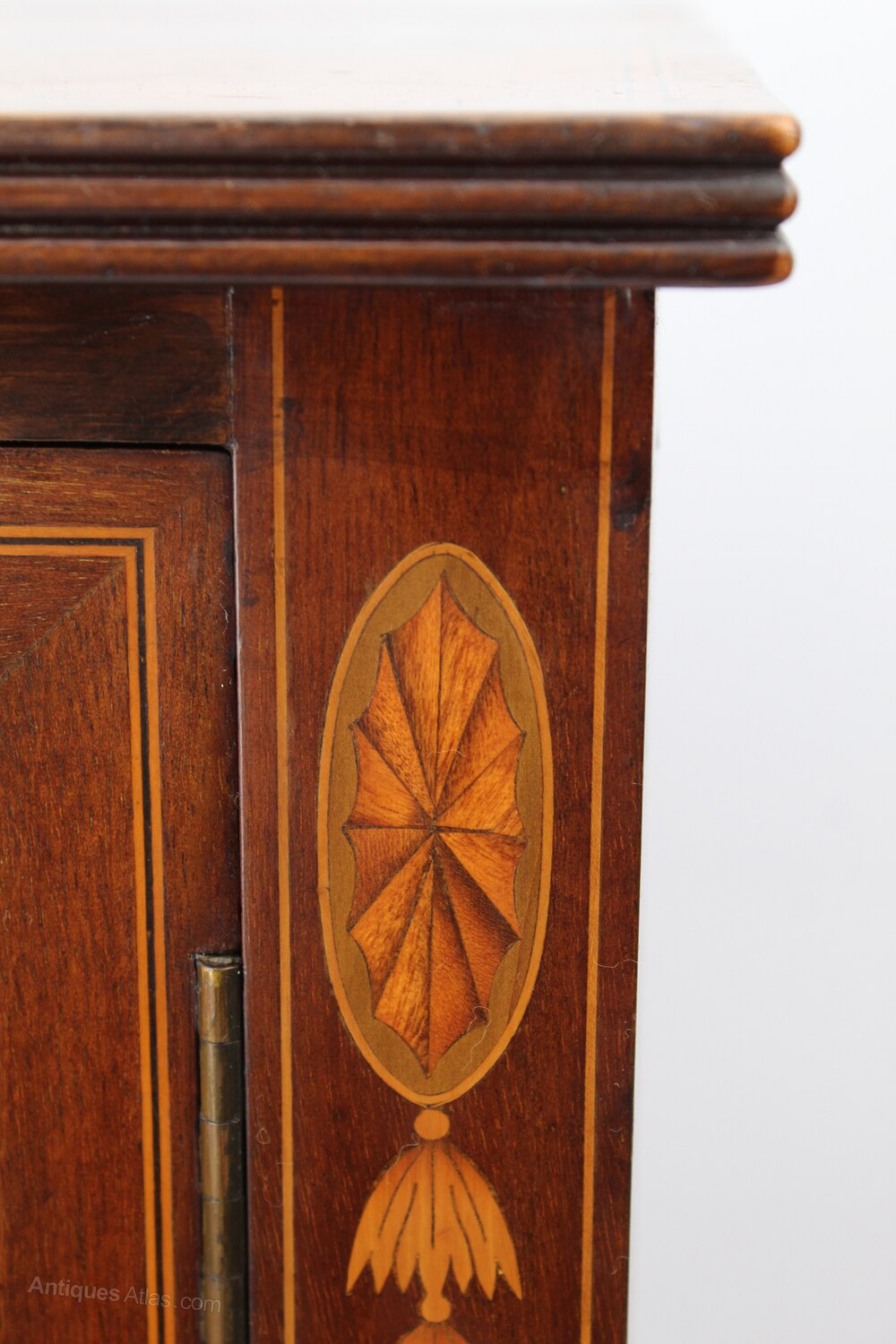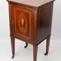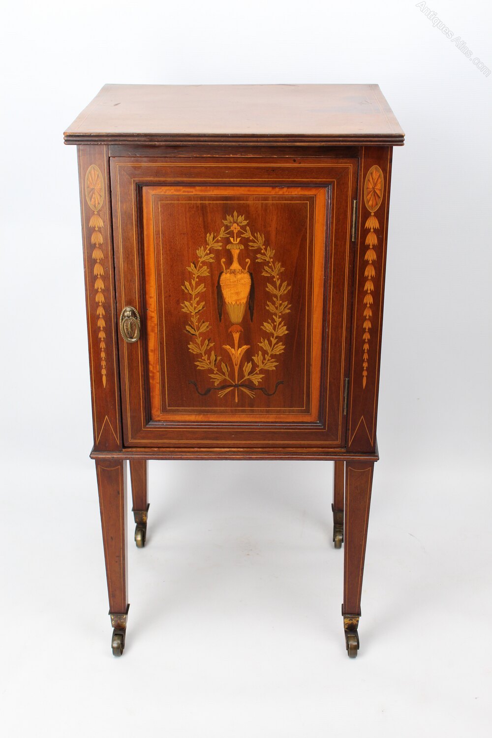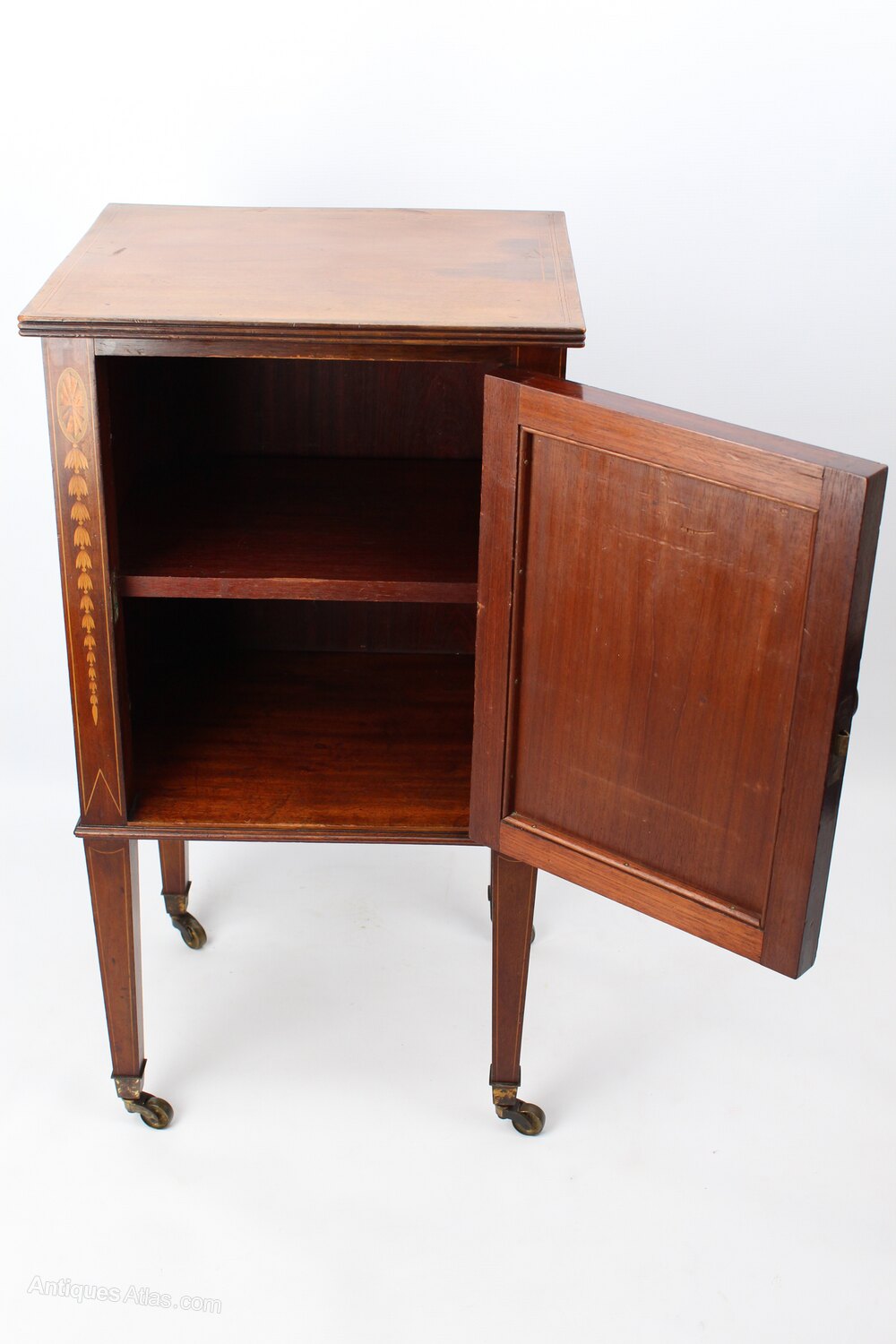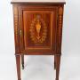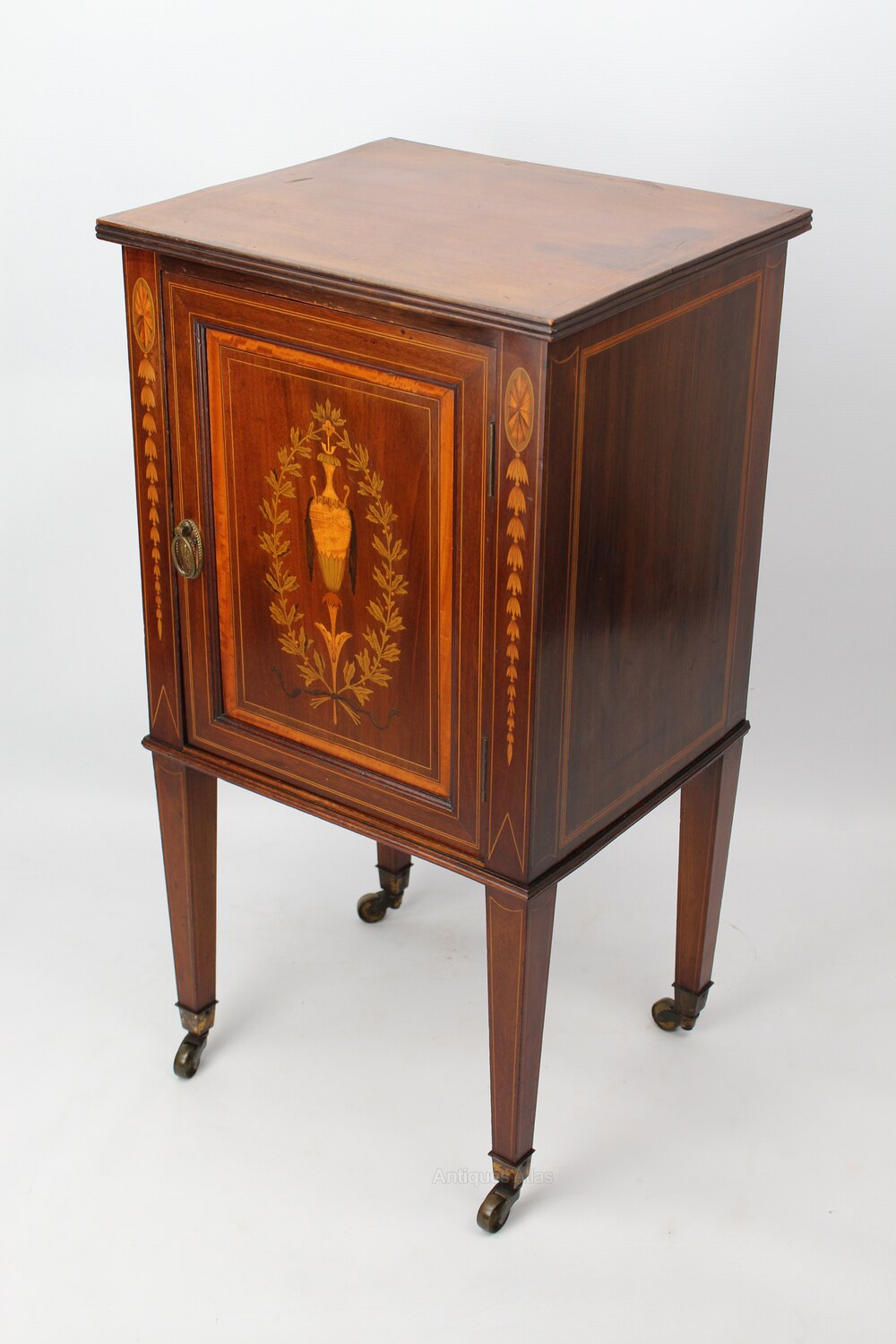 A good quality antique Victorian inlaid mahogany bedside cabinet dating from circa 1895 by JAS Shoolbred & Co. In a wonderfully figured mahogany, inlaid throughout, it has a single panelled door with fancy brass drop handle. The door is inlaid with a wonderful floral marquetry design and opens to reveal a single removable shelf to the interior. It stands on elegantly tapered legs terminating in original brass casters. Stamped to back “JAs Shoolbred & Co”.Construction/Wood: