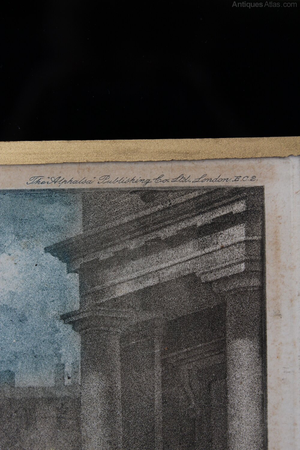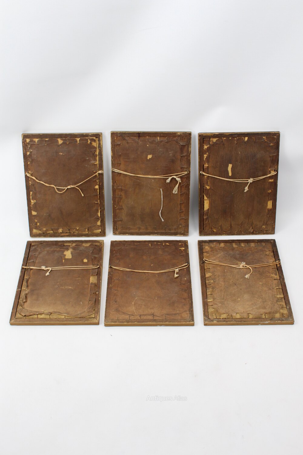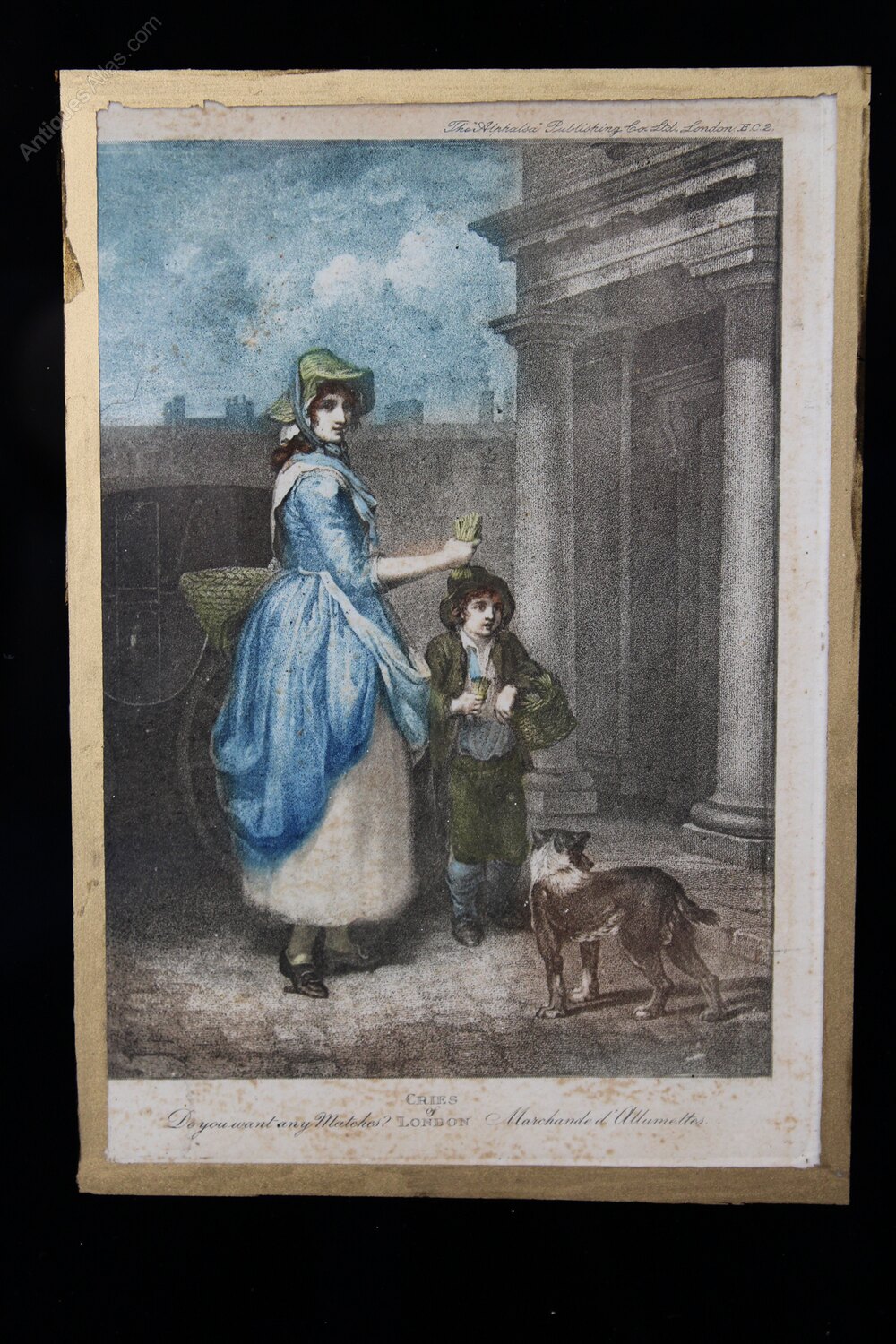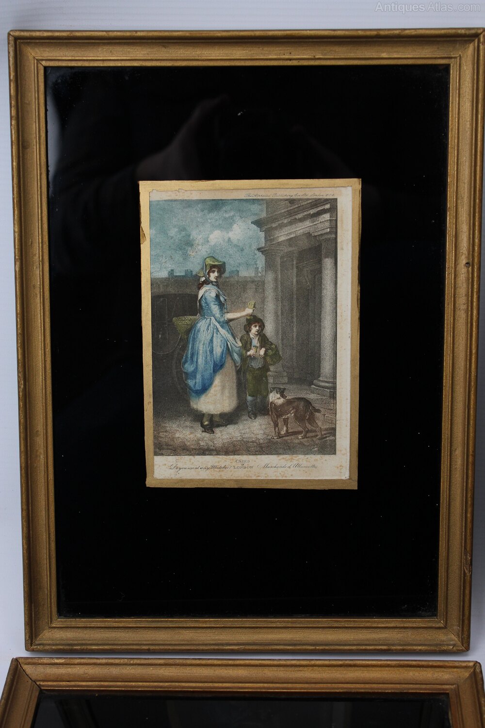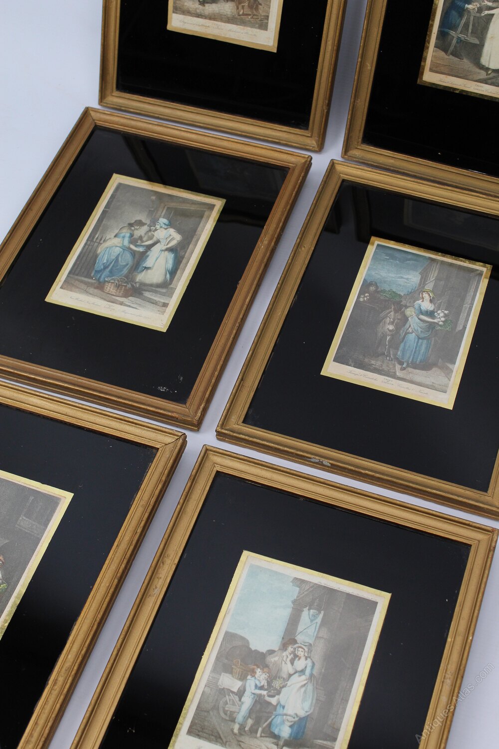 A charming set of 6 antique prints form Wheatley’s the Cries of London dating from circa 1920s. Marked “The Alphalsa Publishing Co Ltd London E.C.2”. The series was produced between 1792 and 1797, documenting street traders in 18th-century London. These decorative prints are displayed in verre eglomise frames with black reverse painted surrounds and gilt line edging.Construction/Wood: