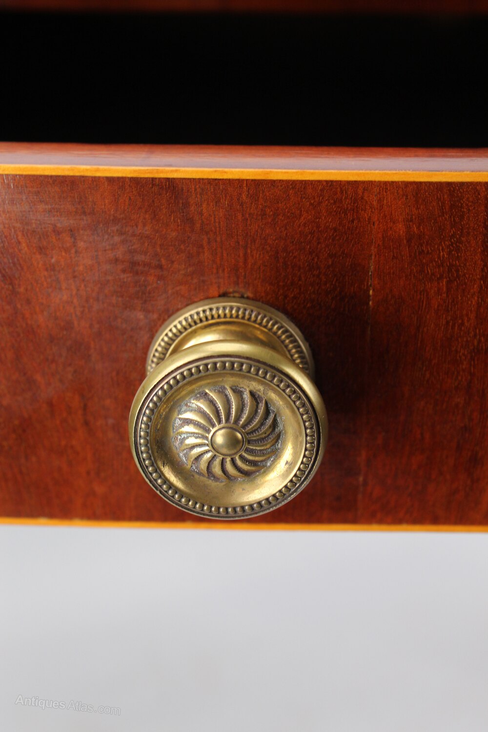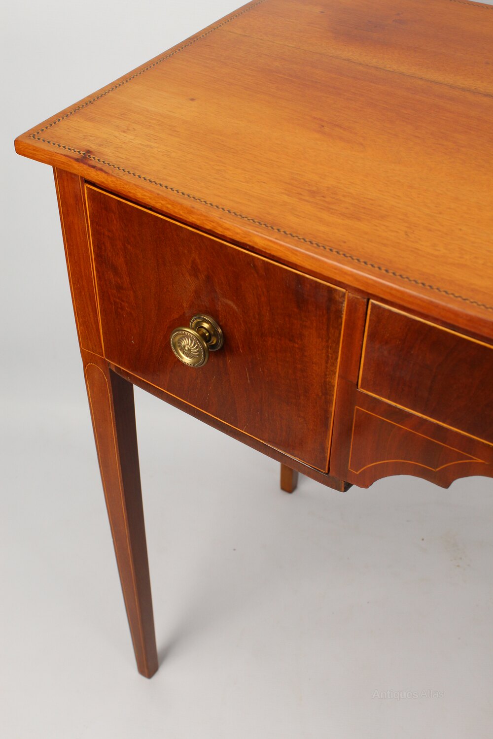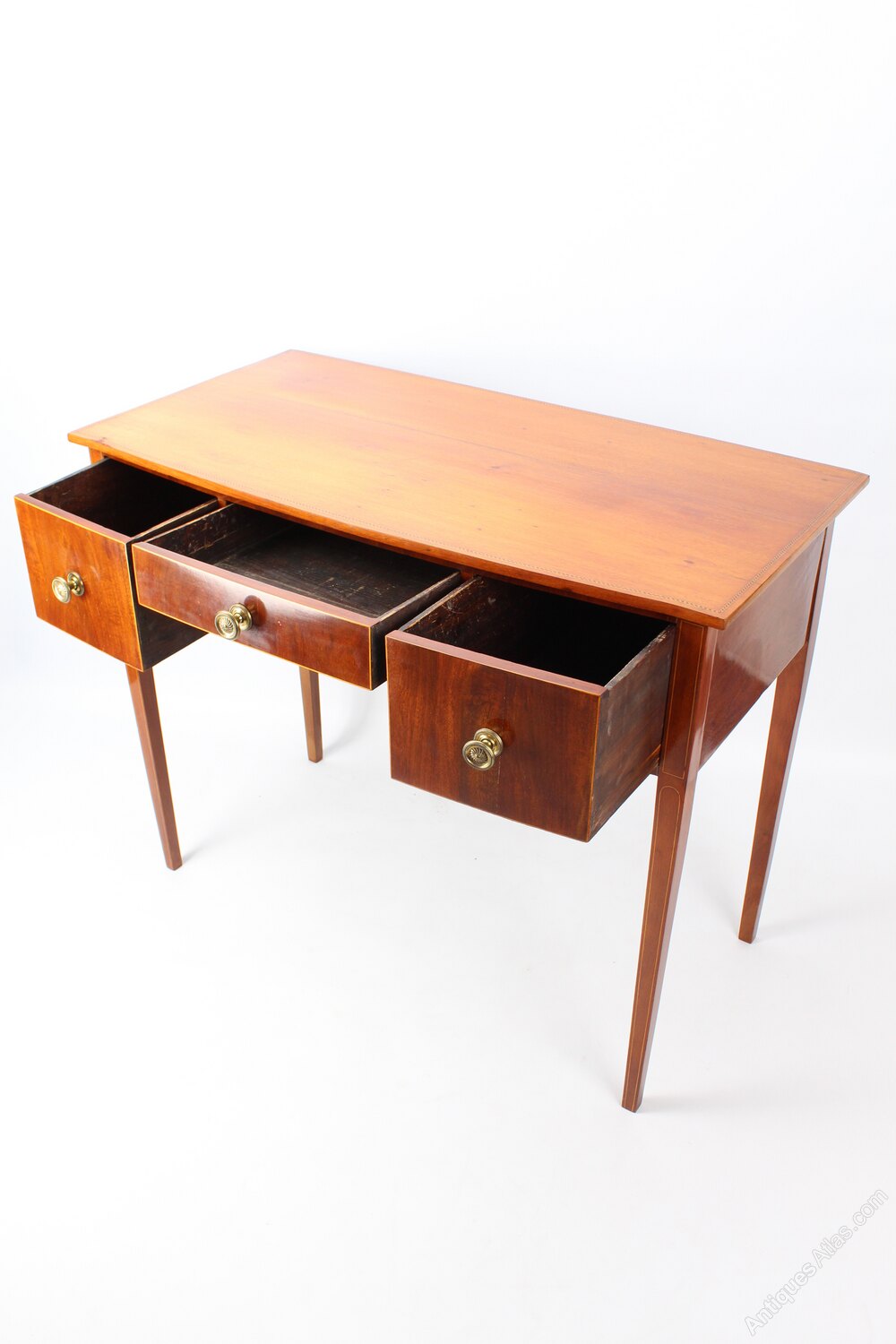 A handsome antique Georgian inlaid mahogany writing desk dating from circa 1820. Featuring an inlaid top over three capacious drawers with satinwood inlay and turned brass handles all standing on tapered square legs. A good size, offering plenty of work and storage space, would also make a good dressing table.Construction/Wood: