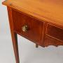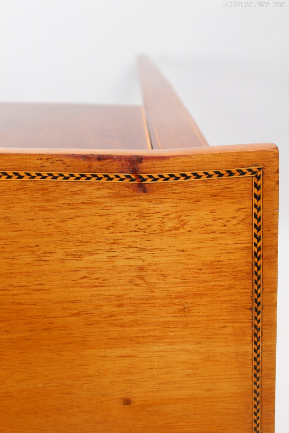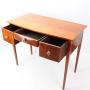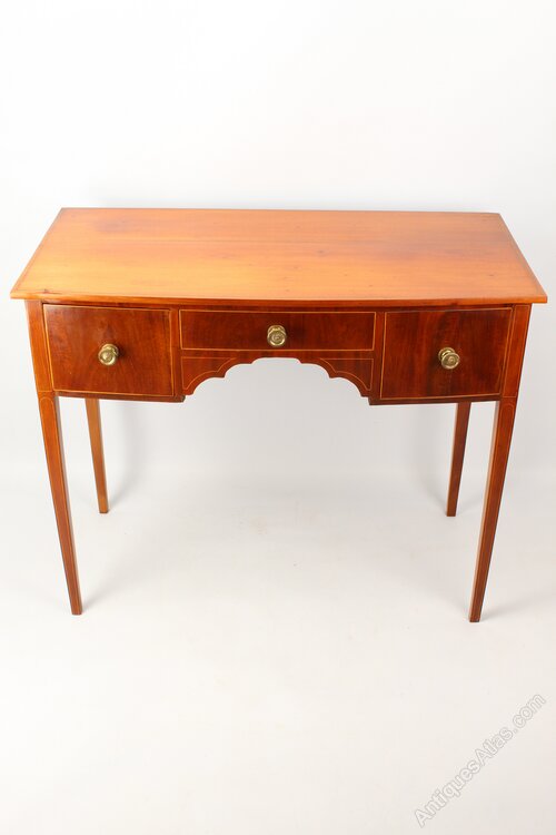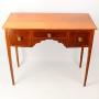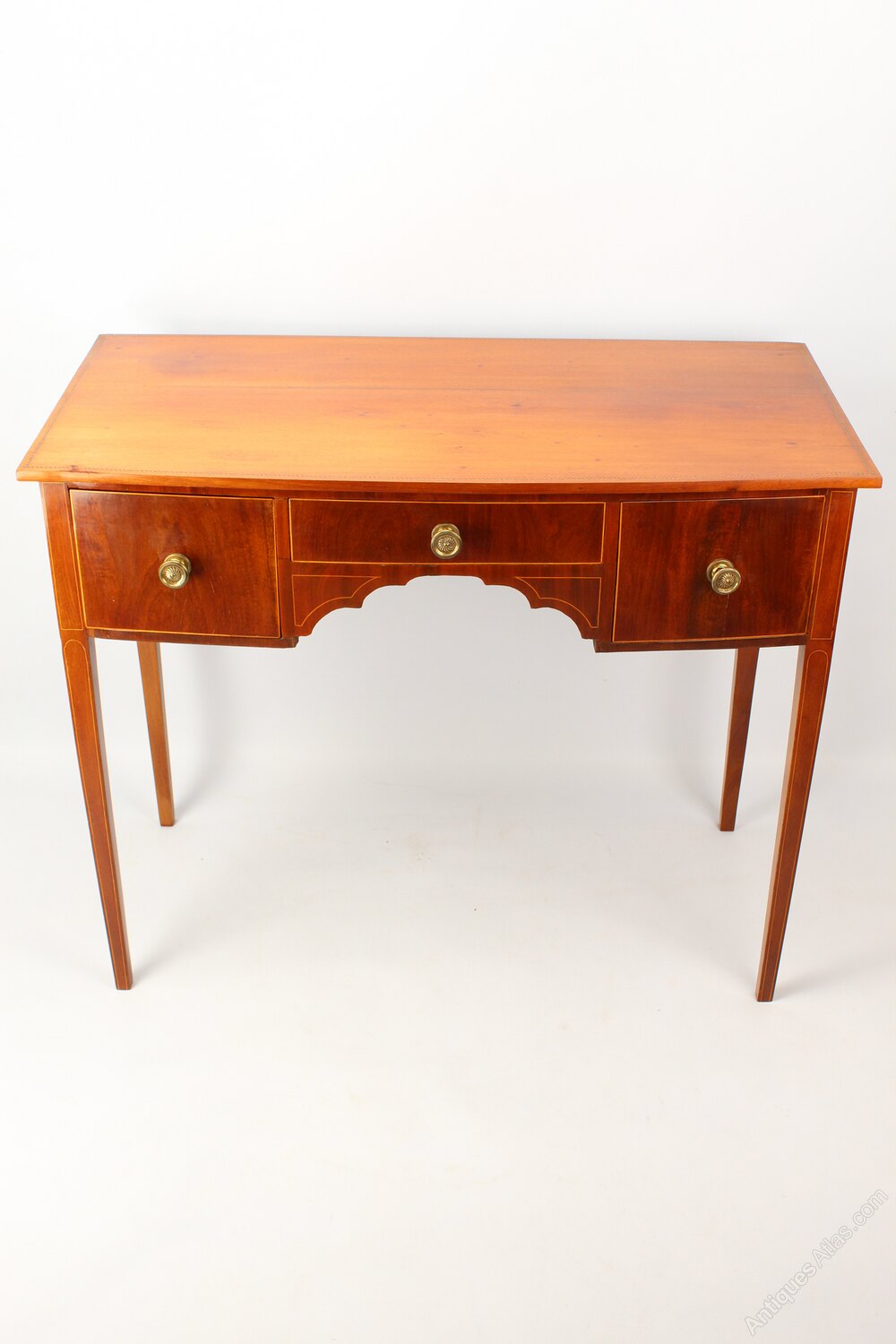 A handsome antique Georgian inlaid mahogany writing desk dating from circa 1820. Featuring an inlaid top over three capacious drawers with satinwood inlay and turned brass handles all standing on tapered square legs. A good size, offering plenty of work and storage space, would also make a good dressing table.Construction/Wood: