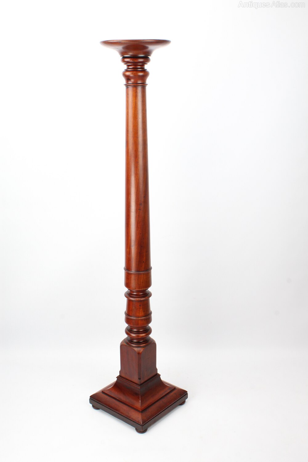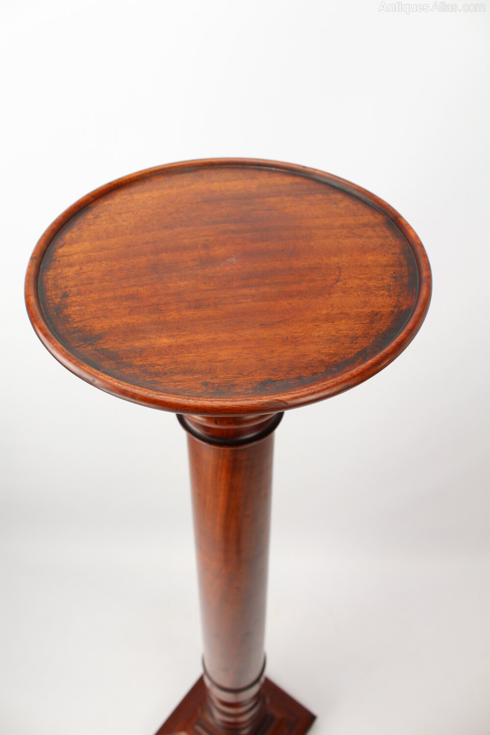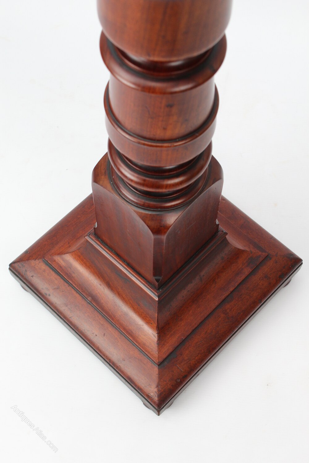 A tall and very good quality antique Victorian mahogany torchere or bust / plant stand, dating from circa 1880. In beautifully figured solid mahogany with wonderful patina, this is a very heavy piece. Featuring a circular dish top and standing on a beautifully turned column with stepped square base terminating on bun feet. A quality example in good condition with good colour and patina.Construction/Wood:
