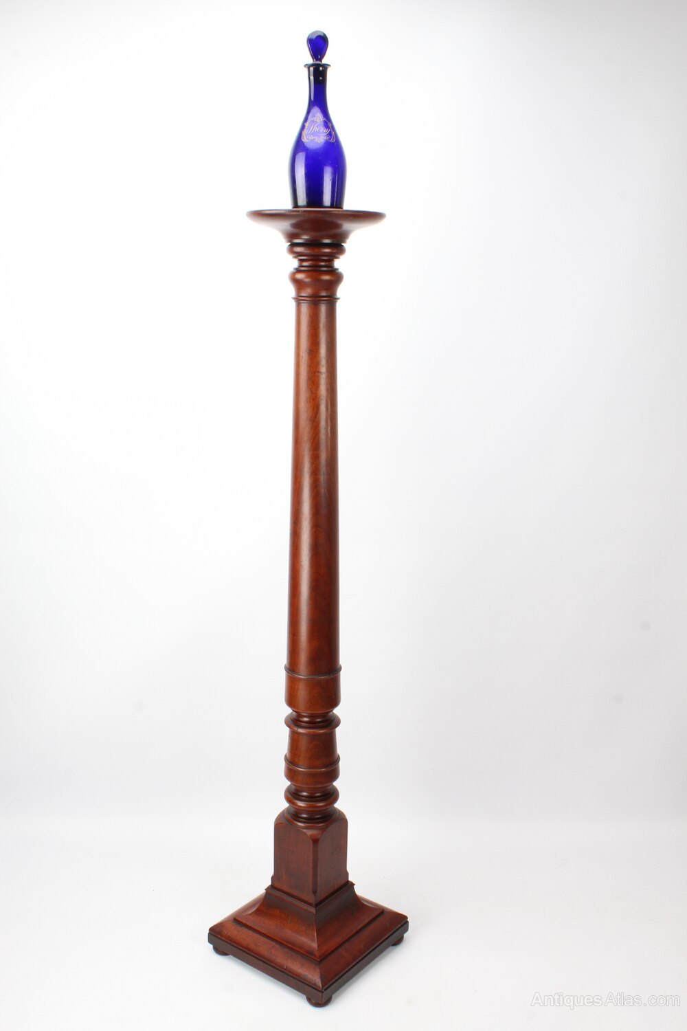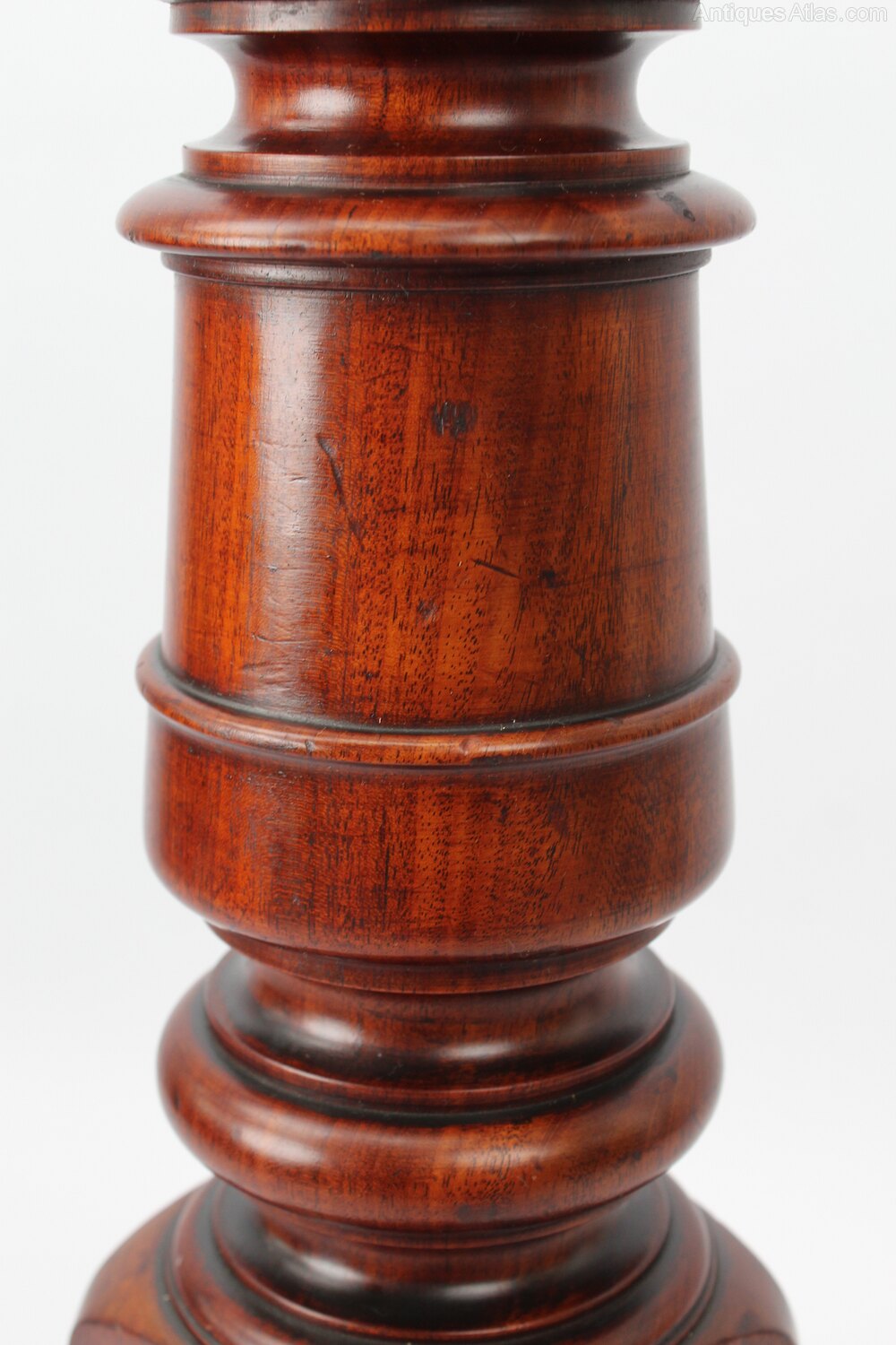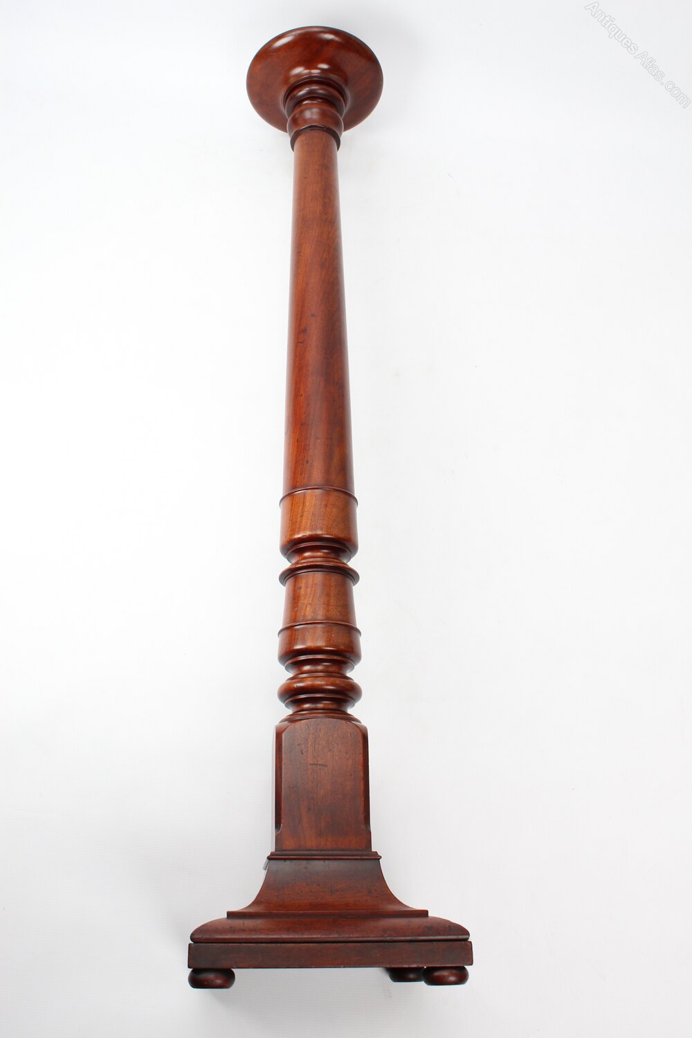 A tall and very good quality antique Victorian mahogany torchere or bust / plant stand, dating from circa 1880. In beautifully figured solid mahogany with wonderful patina, this is a very heavy piece. Featuring a circular dish top and standing on a beautifully turned column with stepped square base terminating on bun feet. A quality example in good condition with good colour and patina.Construction/Wood: