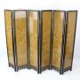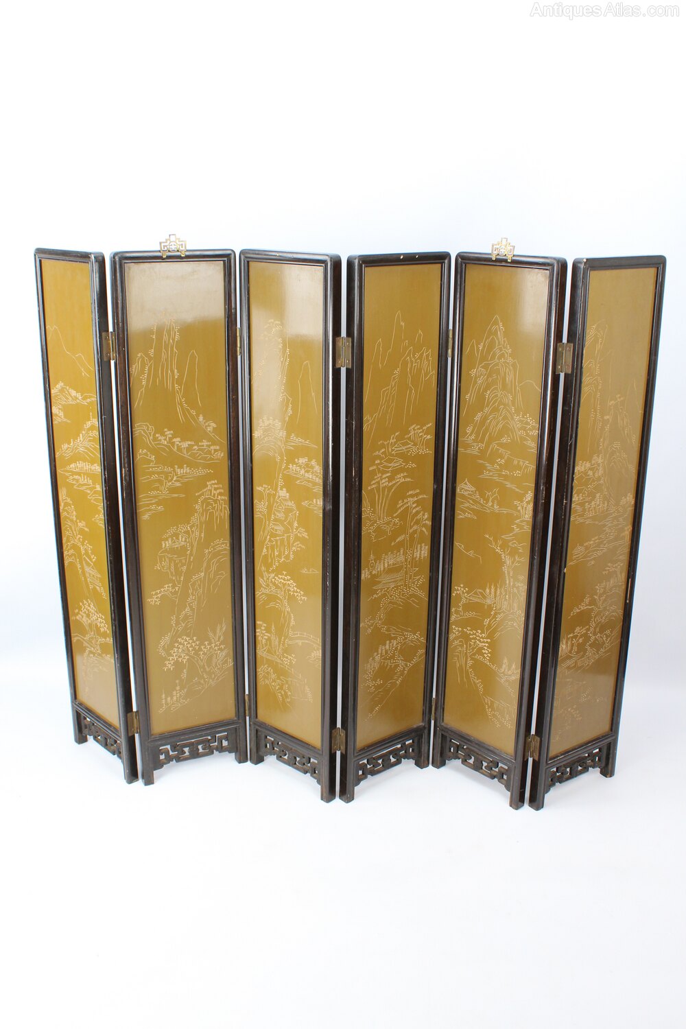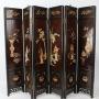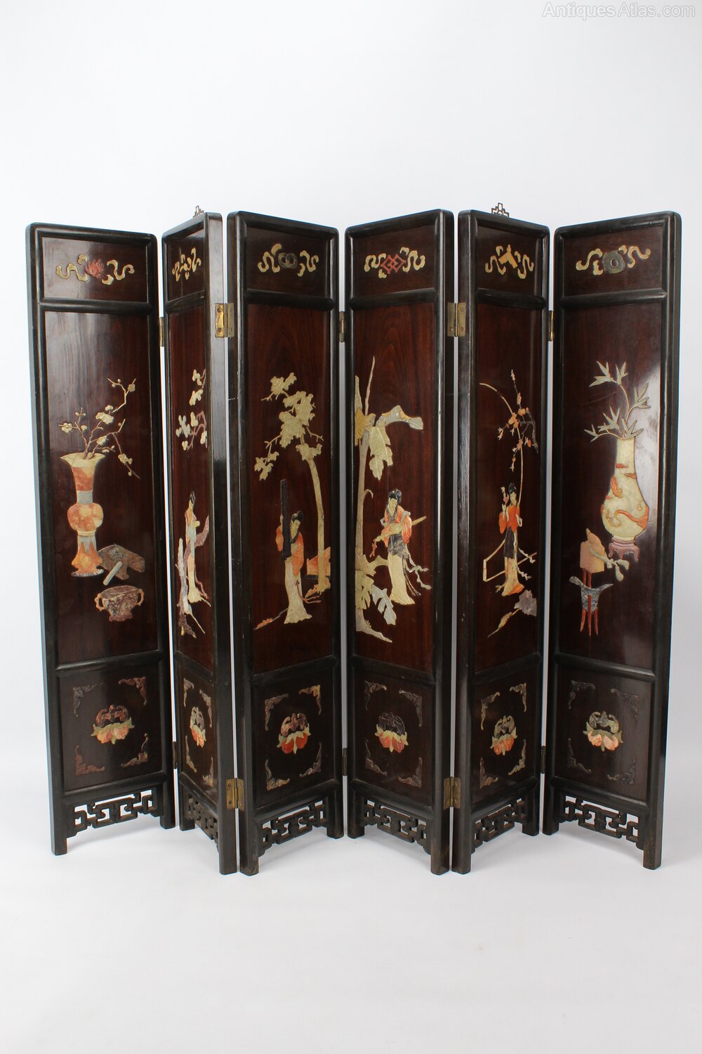 An impressive Chinese six-panel folding screen featuring carved soapstone decoration dating from circa 1920s. Each panel has three recessed windows profusely decorated with colourful carved soapstone. The four inner panels are decorated with female figures with trees and the end panels feature scholars objects and vases with cherry blossom and bamboo leaves. The screen is supported by square legs with decorative pierced pelmet. The reverse side is decorated with a scratch carved landscape with mountains, houses and trees. Standing 3ft6″ tall the six folding panels fold away completely on brass hinges, so when not required it can be neatly tucked away. Would make a wonderful fire screen or could be hung on a wall as a decorative wall feature.Construction: