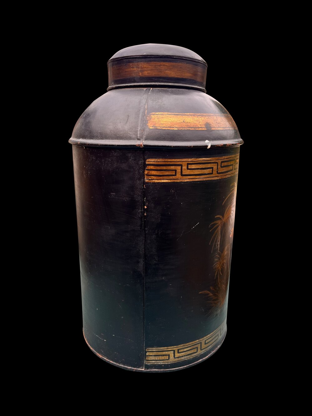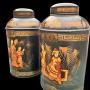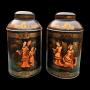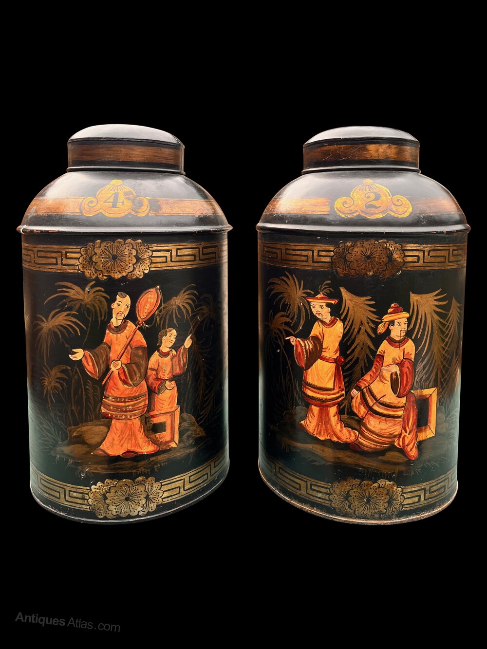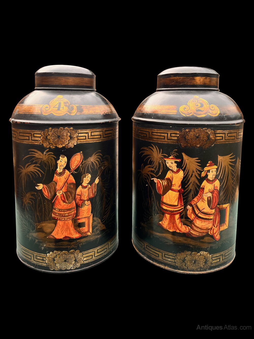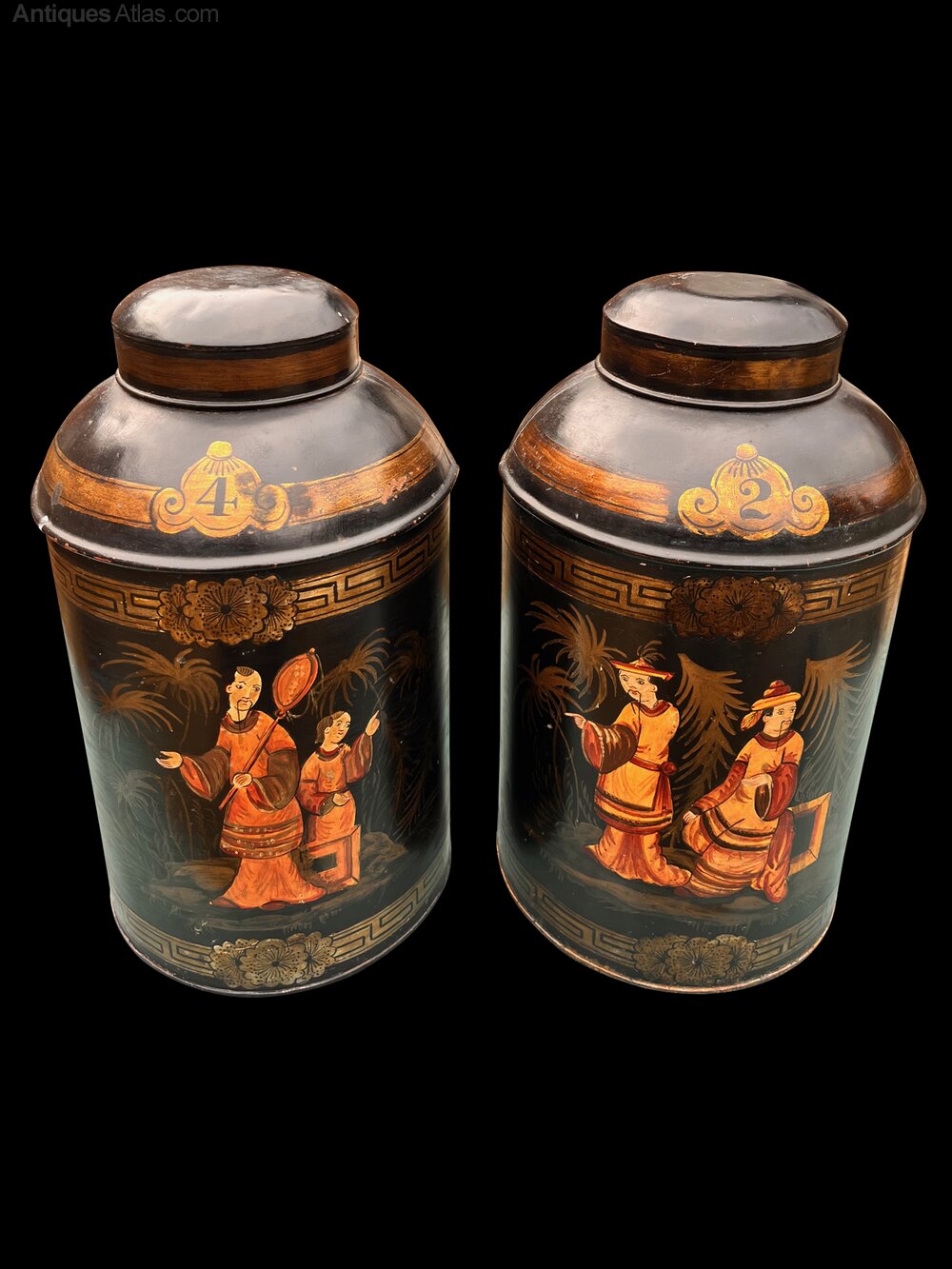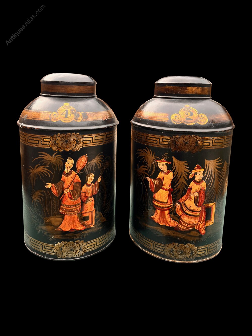 Good C19th pair of Chinoiserie lacquered tole tea canisters . The domed tops retaining their original lids and numbered 2 and 4, the fronts depicting a different Chinese scene of figures in a floral landscape. Good condition with minor dents and distressing commensurate of age and useEnglish circa 1880