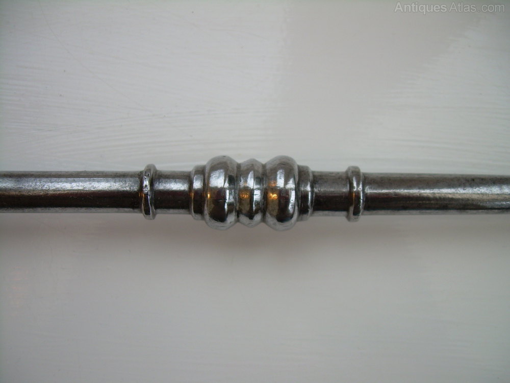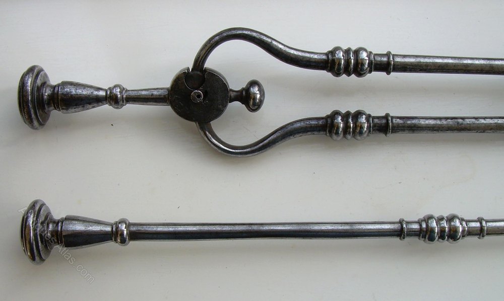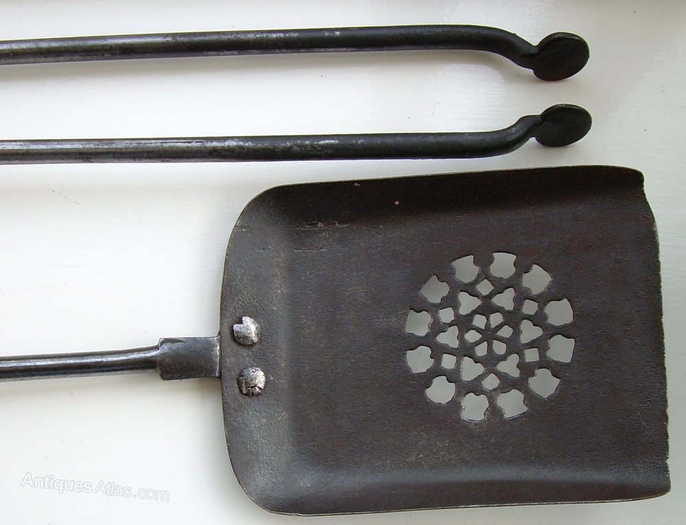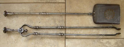 A pair of decorative steel mid Victorian fire irons comprising a pair of fire tongs and an ash pan.DateMid Victorian