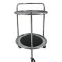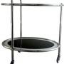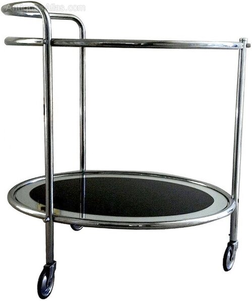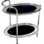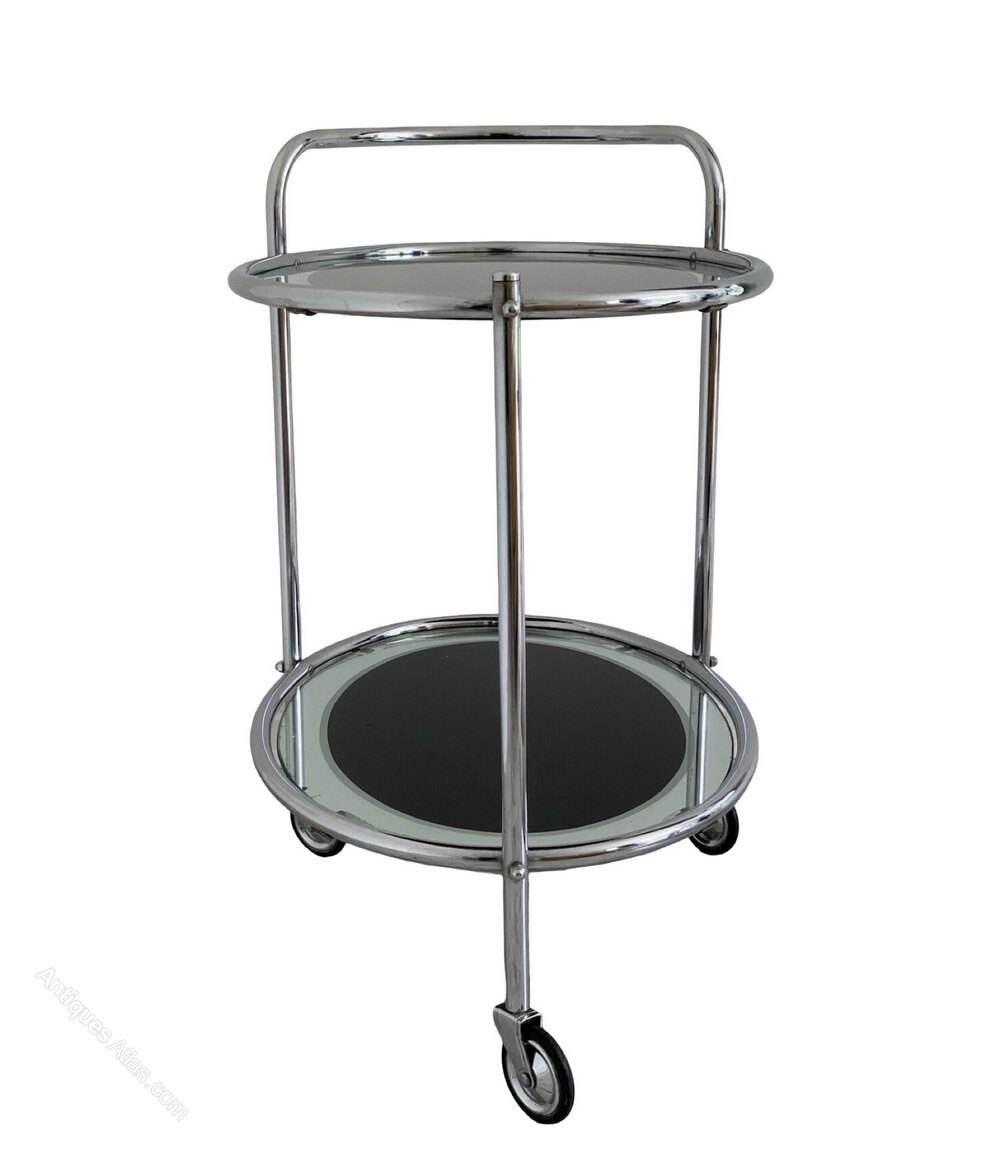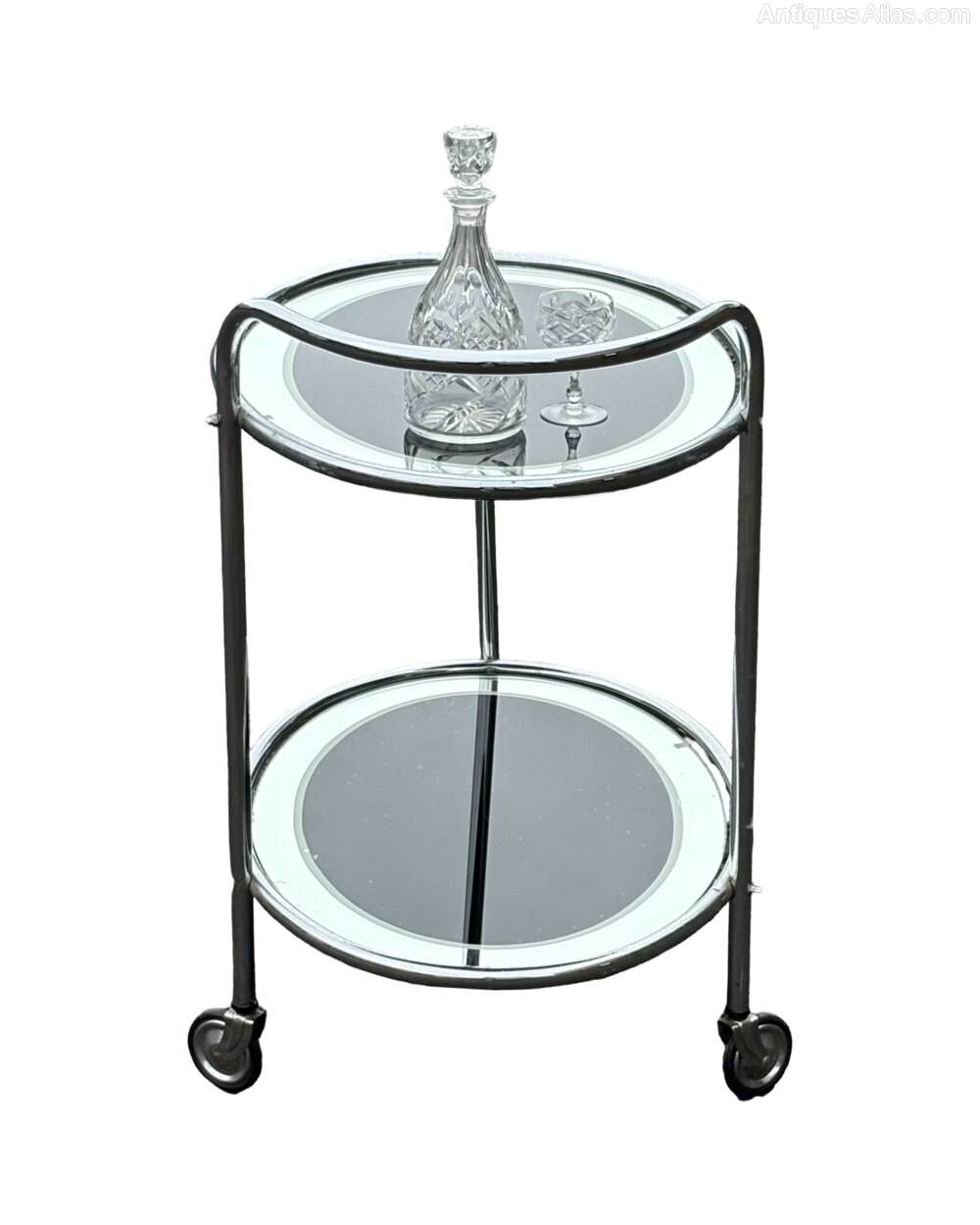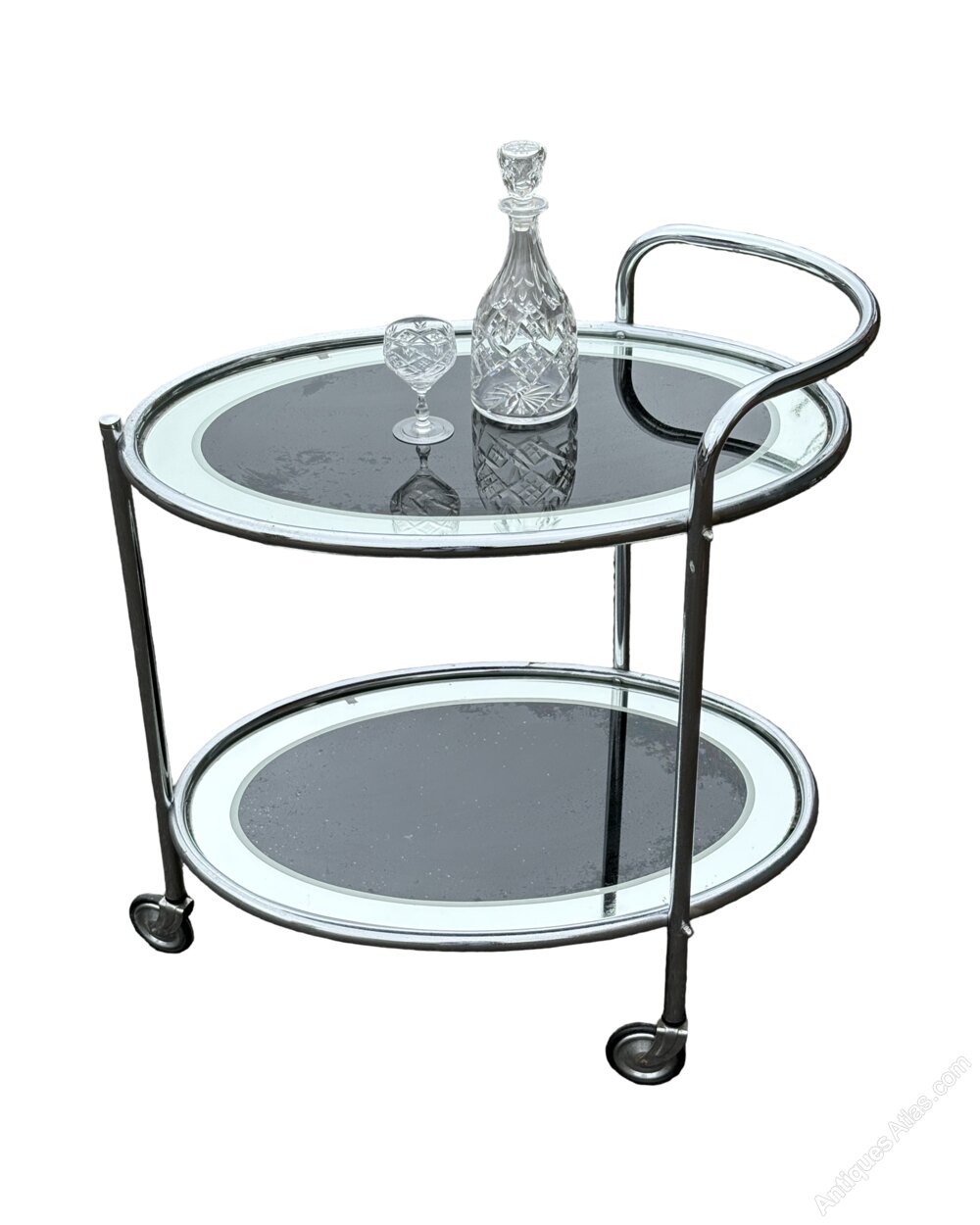 A fabulous Chrome and black mirror Art Deco Drinks Trolley in very good condition having been recently rechromed. The 2 black mirror shelves are in good condition with a few minor marks commensurate with age. The chrome surround provides a solid and firm support for the mirrored glass. This trolley has original chrome casters which work beautifully.Height to top of handle 29”/73 cms