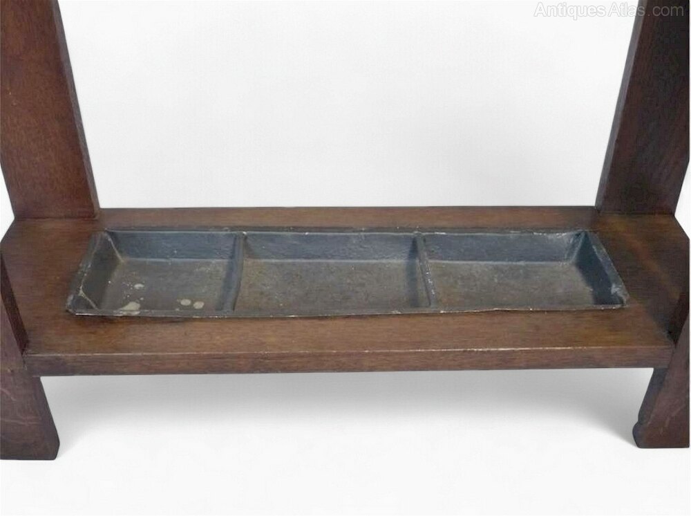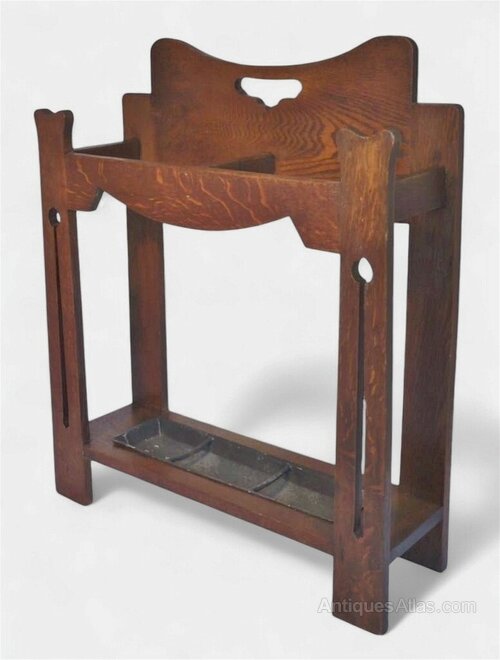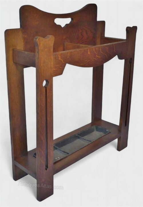 Nice quality arts and crafts umbrella / stick stand in oak , with stylised , shaped and cut out decoration . Retains it's original metal base .DateArts and Crafts :