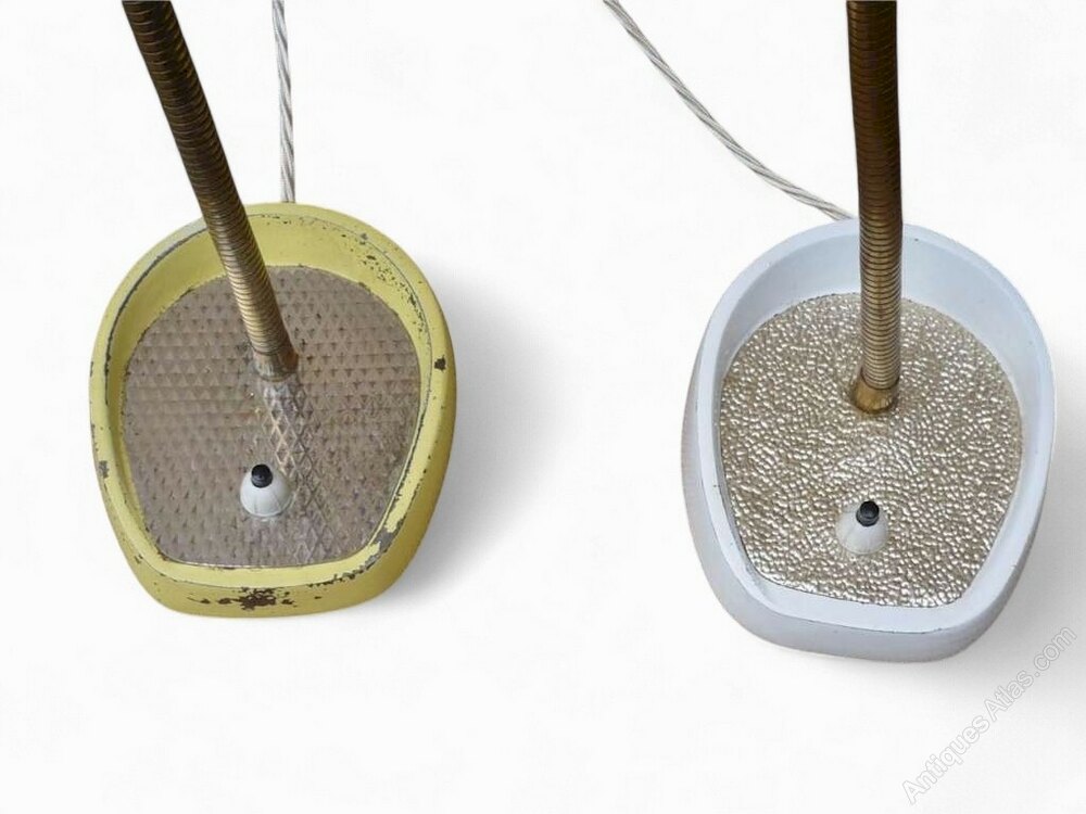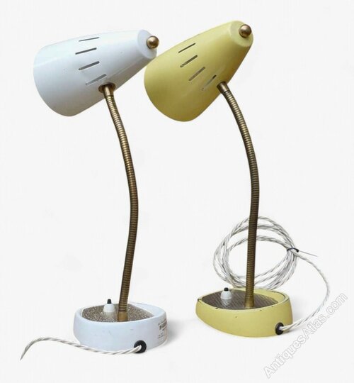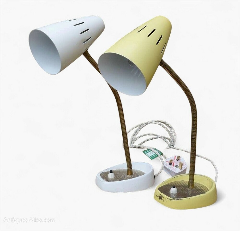 Good near pair of 1950/60's table/desk lights by Pifco , model 971 with gooseneck stems. These can also be used as wall lights . Rewired using silk cord , PAT tested with certificate and ready to plug in . Priced for the pair .DateRetro :