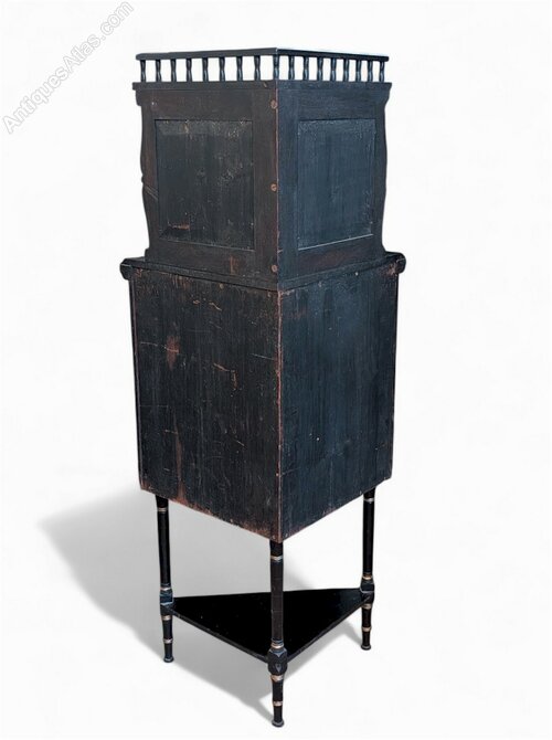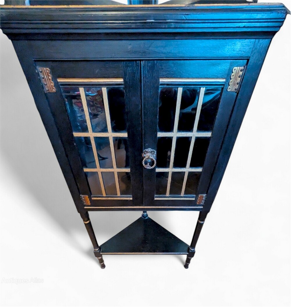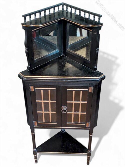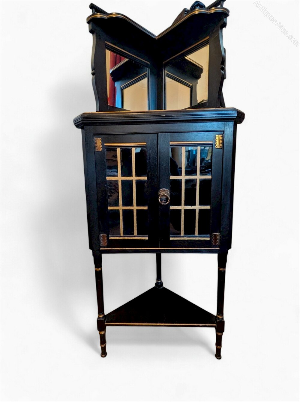 Small Aesthetic movement corner cabinet , on thin turned legs , in the Japanese style . 2 original mirrors at the top with storage below enclosed by latticed doors . Ring turned gilt decoration and working lock with key supplied .DateAesthetic Period :