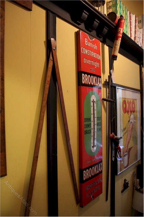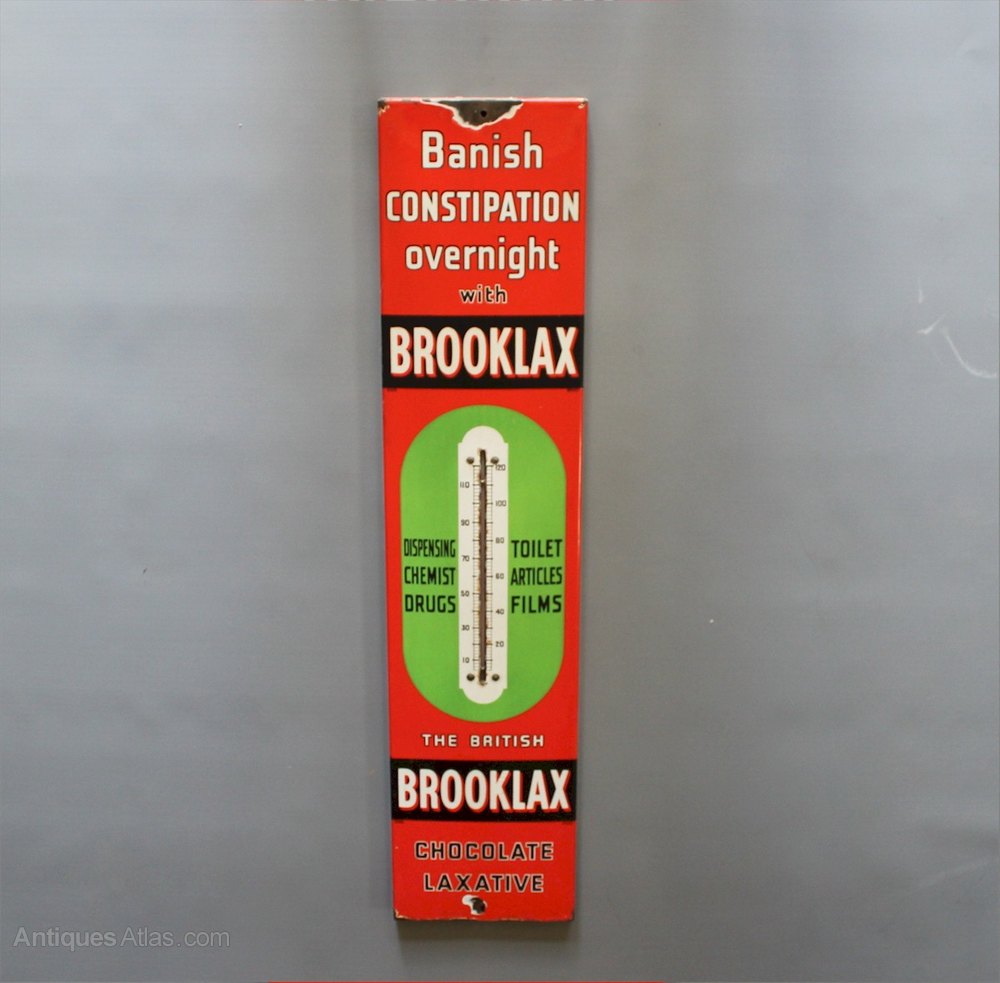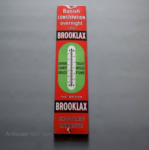 Rare vintage enamel advertising thermometer sign for Brooklax Laxative Chocolate. Vivid colours good decorative piece. Glass thermometer is missing. Measures 91.5 cm high x 21.5 cm wide x 2 cm deepDateGeorge VI :
