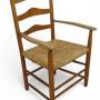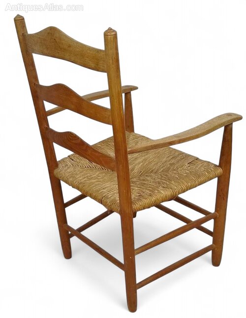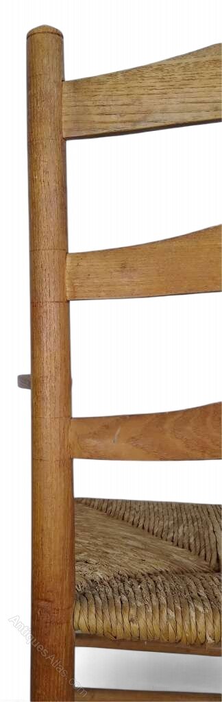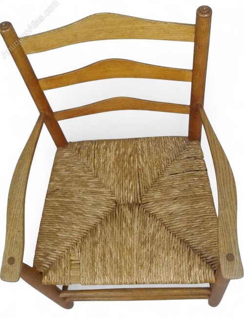Pretty arts and crafts childs chair in the Cotswold style made by Neville Neal .Having studied under Edward Gardiner , he eventually moved back to Stockton setting up a workshop where his son still makes chairs today . Good original condition with minor losses to the rush , which could be re-rushed if required . Stamped marking to the leg .W.15"/38cm x D.13.5"/34cm x h.25.25"/64cm