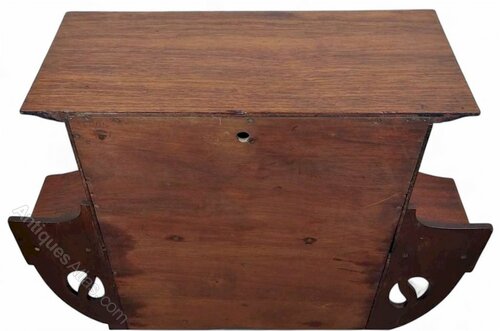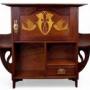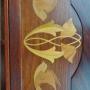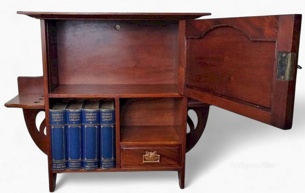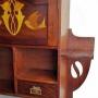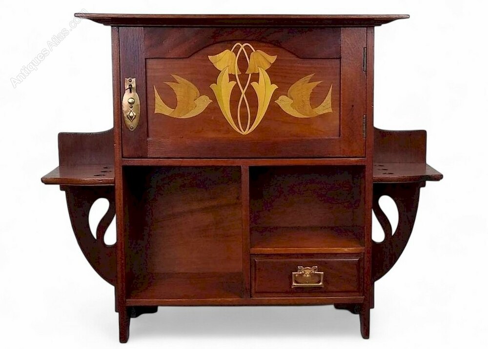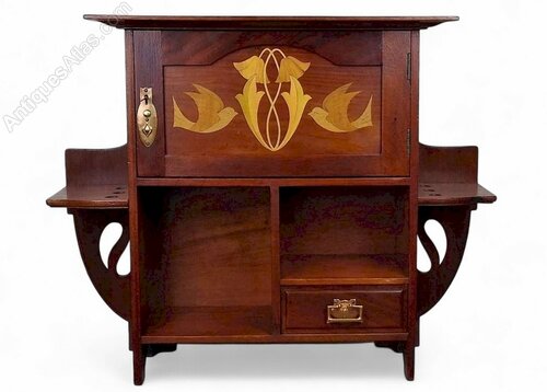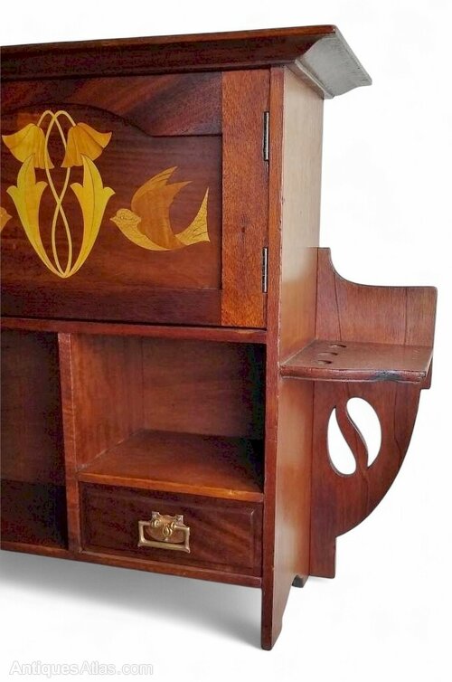 Rather lovely wall cabinet in mahogany by Shapland and Petter of Barnstable . The door features an inlaid panel of exotic woods portraying flying doves and entwined tulips very reminiscent of the work of Baillee Scott . The drop handle from the door is probably missing although the lock , which is stamped , is working with the key supplied . There is also a slight candle burn to the underside of one shelf ( see photo ) the supports of which are decorated with yin/yang cut outs on both sides . It has been cleaned and waxed and actually looks better in real life .W.27"/68.5cm x D.9"/23cm x H.21.75"/55.5cm