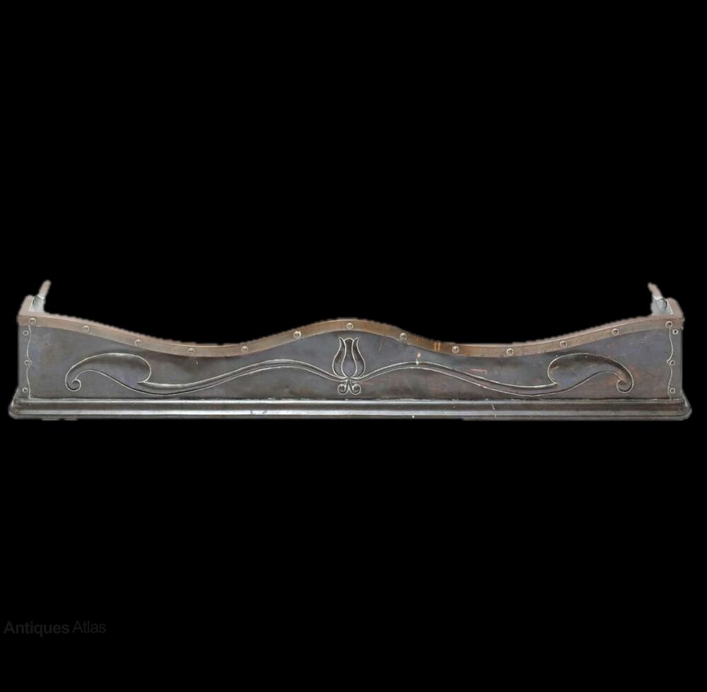 An Arts and Crafts bronze and copper fender, c.1910, in the manner of John Pearson, with repoussé decoration in the form of scrolling leaves joining at a central tulip, with a studded copper edge, measures 19cm high x 127cm wide x 31cm deepDateArts and Crafts :