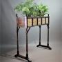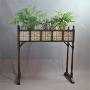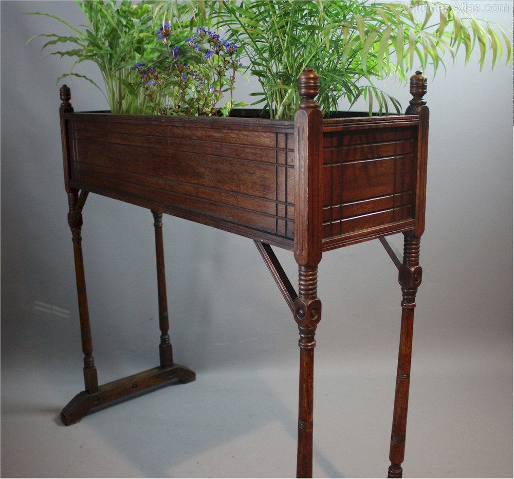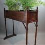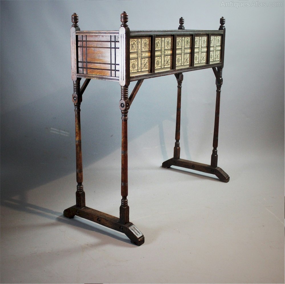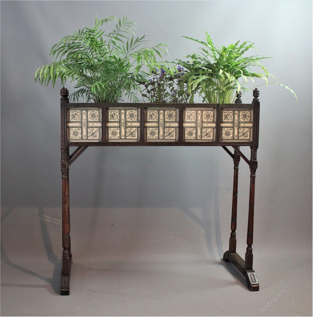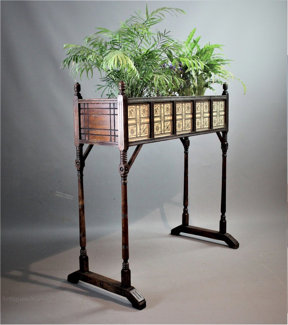 Aesthetic Movement planter with tiled front. Pretty aesthetic movement planter of rectangular form inset with three aesthetic movement tiles with foliate scroll decoration. On turned supports and finials on sledge feet. Measures 88.5 cm high x 87 cm wide x 27 cm deepDateAesthetic Period :