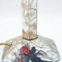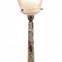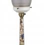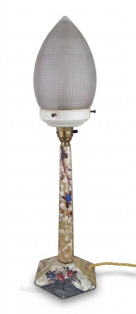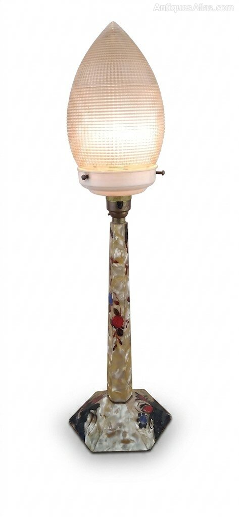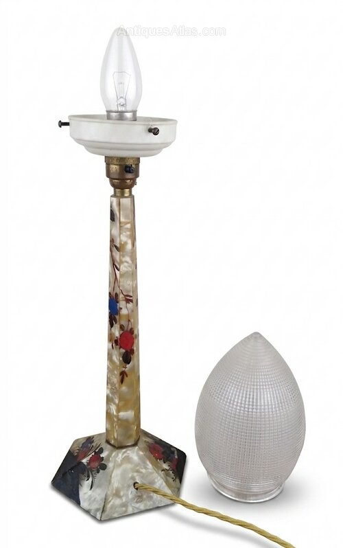 Unusual 1920/30's art deco table lamp in cellulose which has been overpainted in oil with Japanese/Chinese landscape, bird and flower scenesand which supports a period , cone shaped prismatic shade . Slight paint loss to the house and birds scene ( see photo 5 ) , the lamp has been rewired with silk cord rertaining it's original switch , PAT tested with certificate and is ready to plug in . This is very pretty and seems to shimmer even in daylight .