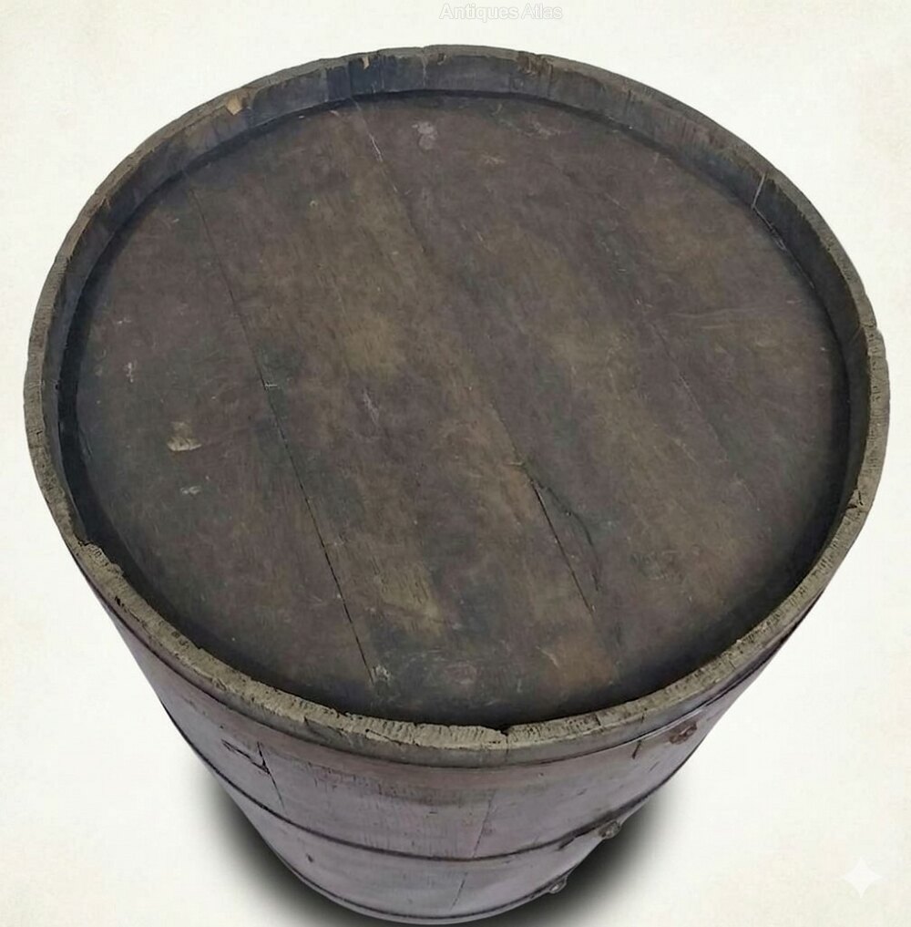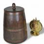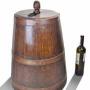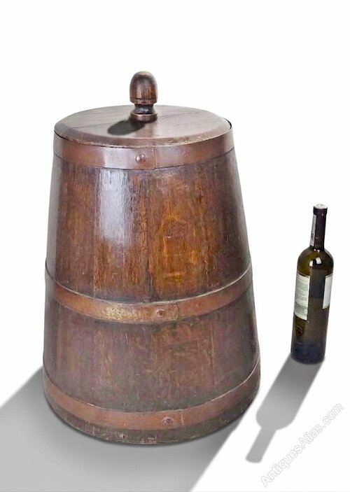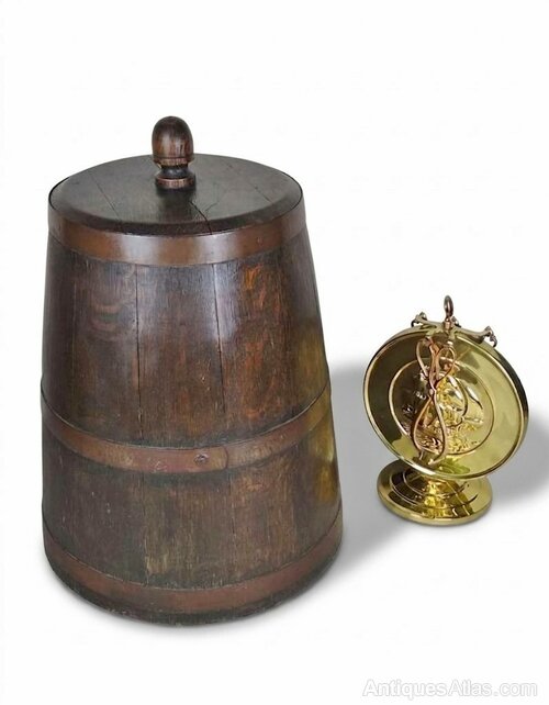 Substantial , arts and crafts log bin in oak , of coopered construction in a bell shaped tapering form ,retaining it's original well fitting lid and acorn handle and supported by traditional , rivetted iron bandings .Good original condition , cleaned and waxed .Diam of base.17.5"/44.5cm x H.25"/63.5cm