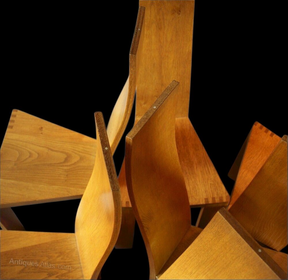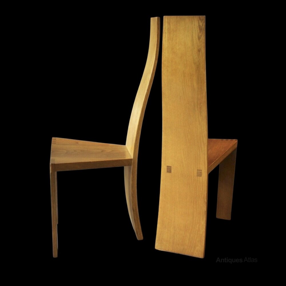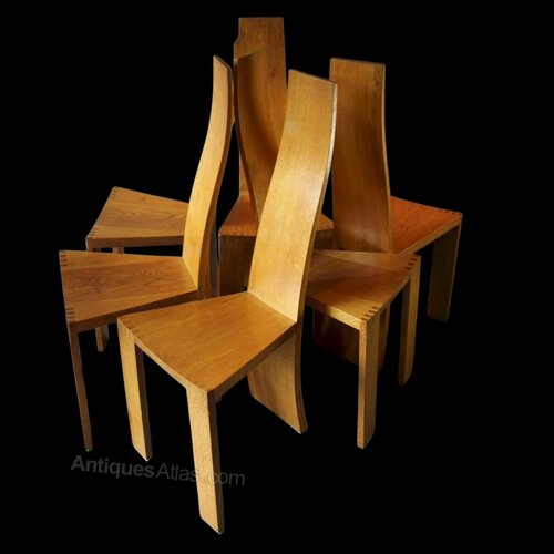 Pearl Dot set of six oak dining chairs by Robert Williams (b.1942) for Pearl Dot Islington .c1980 Curved high back measures 108 cm high x 40 cm x 40 cmDateRetro :