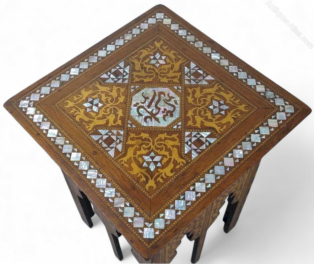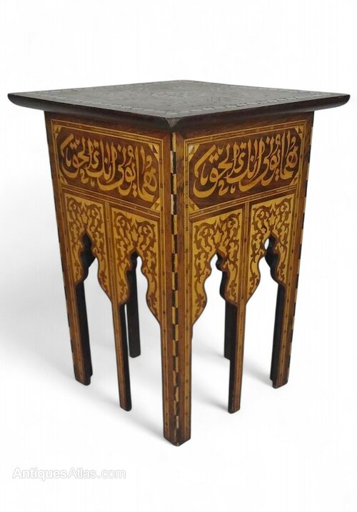 Very pretty Moorish side table , possibly Syrian in origin , of square shape . Each side with double , inlaid Moorish arches , supporting the top which is heavily inlaid with mother of pearl designs . In very good original condition and finish with 2 tiny pieces of mop missing , the table is strong and sturdy .Sq 17.75"/45cm x H.24.25"/61.5cm