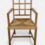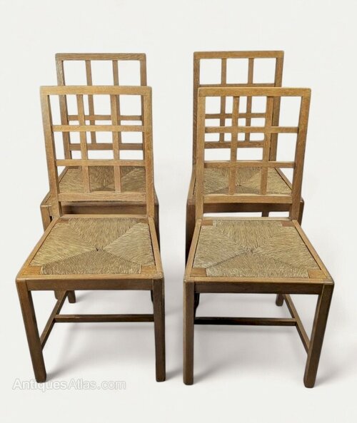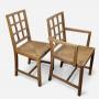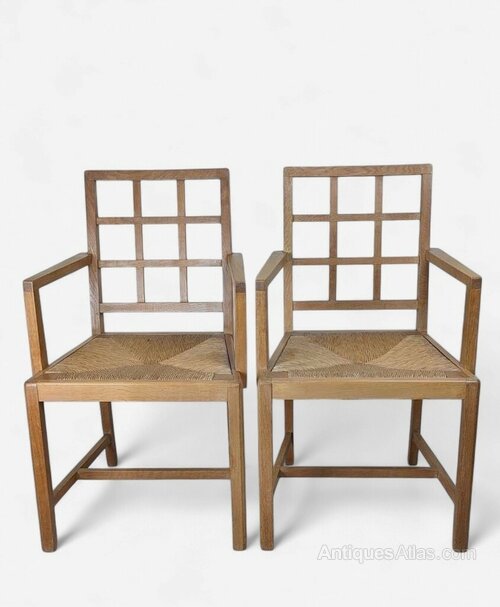 Good set of 6 oak , lattice back dining chairs by Heals , including the hard to find armchairs . Both the frames and the drop in rush seats are in very good original condition , the frames having been cleaned and waxed . Features also doweled joints .Armchairs : W.21"/53.5cm x D.17.25"/44cm x H.35.5"/90cm