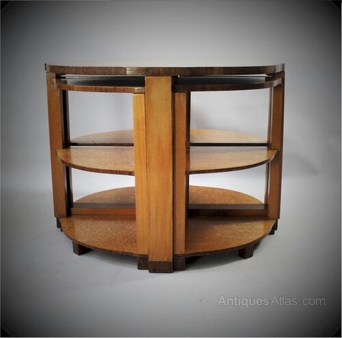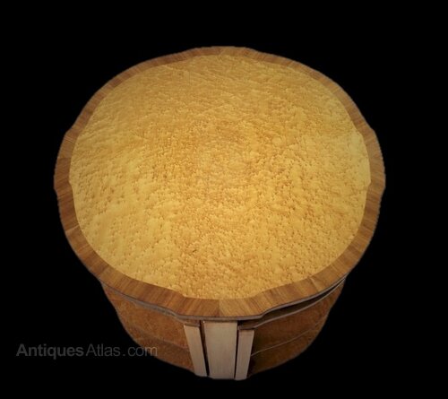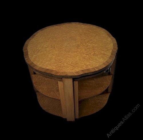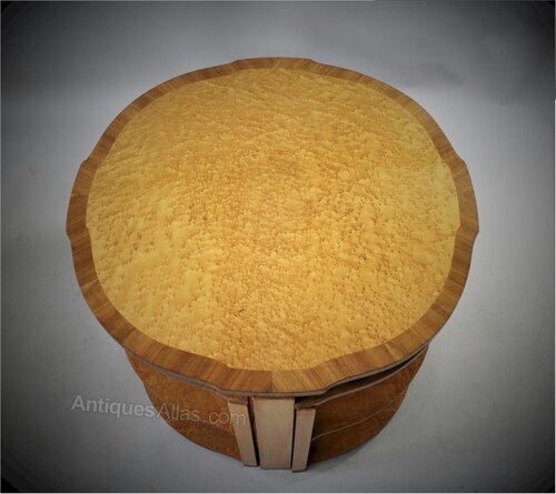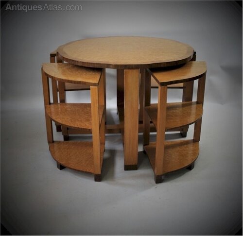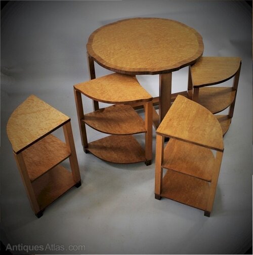 Art Deco nest of five tables. Classic art deco quintetto neat os tables in Bird's Eye Maple with walnut banding. The scalloped top table with four segment table which slide beneath. Measures 55 cm x 74 cm x 74 cmDateArt Deco :