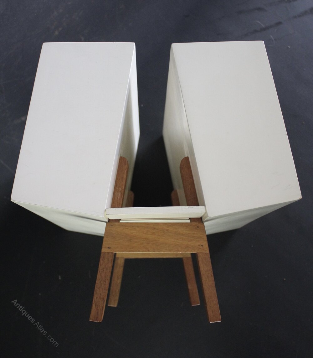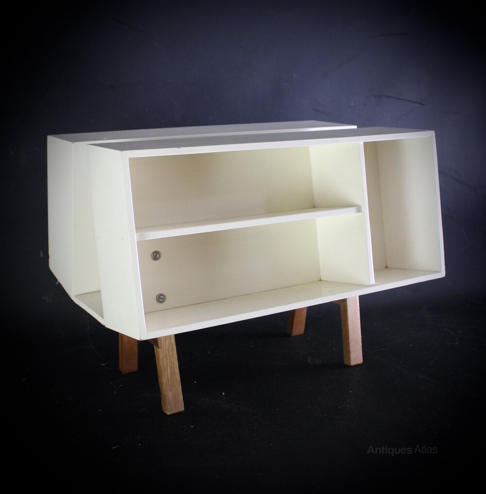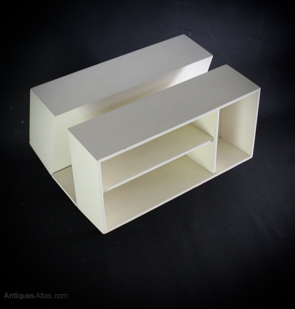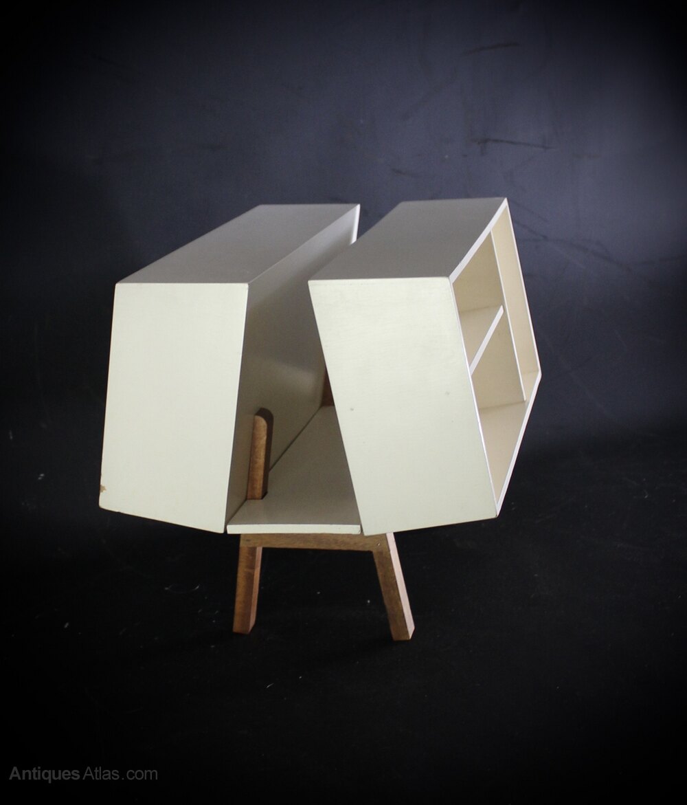 Ernest Race for Isokon Penguin Donkey Mark II .Mid 20th century circa 1960s cream & teak wood bookcase. The bookcase having a two faced diagonal shelves, all raised on squared timber supports. Measures approx. 40cm high x 54cm wide x 40cm deepDateRetro :