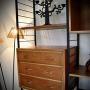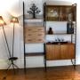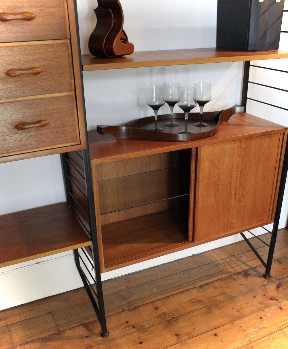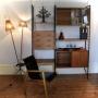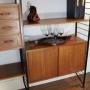 British mid-century "Ladderax" shelving system. Designed by Robert Heal and made by Staples. Teak cabinets and shelves with black steel ladders. Flexible and adjustable, a mid-century classic design. Three canted ladders, I chest of drawers , 1 storage cabinet with sliding teak doors, one display cabinet, these have a glass internal shelf which can adjusted to three various postions. Also 3 teak shelves. Overall height 201 cm x 155 cm wide x 36 cm deep.DateRetro :