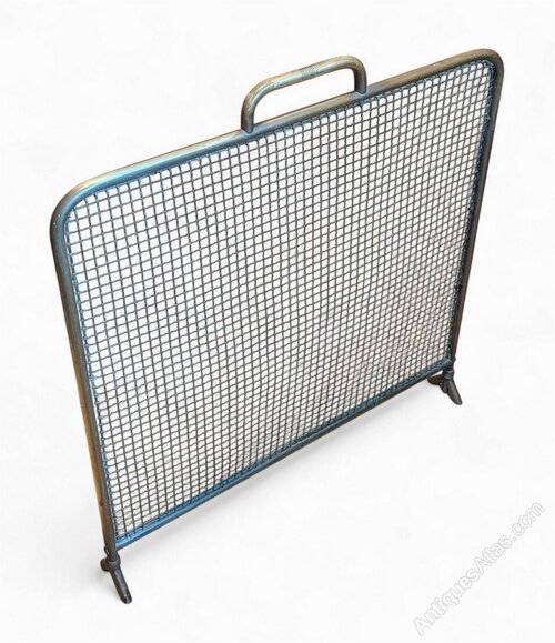 Interesting Victorian fire / spark guard possibly by Benham and Froud .Tubular frame and mesh screen , both in unpolished brass and standing on angled feet , with ring turned handle . Good condition .W.23.25"/59cm x H.24.5"/62cm
