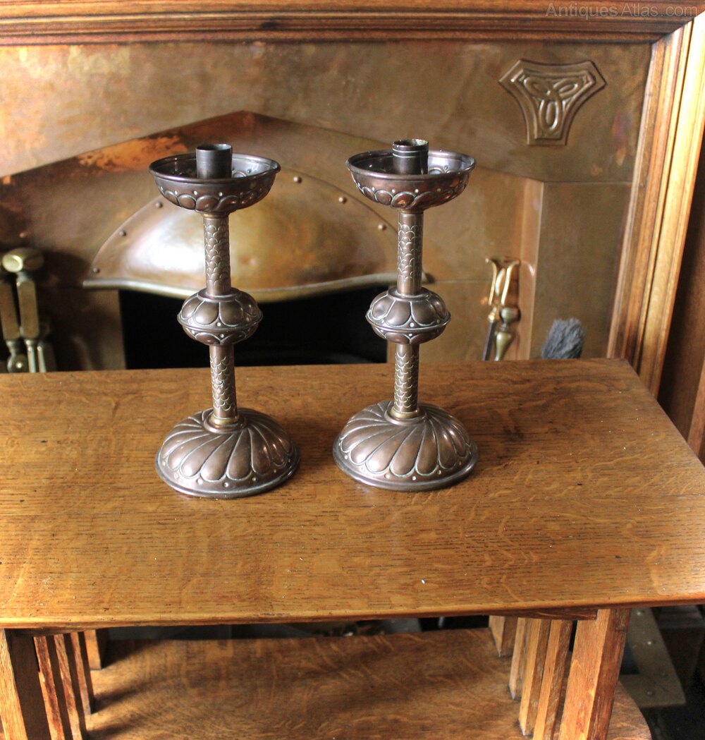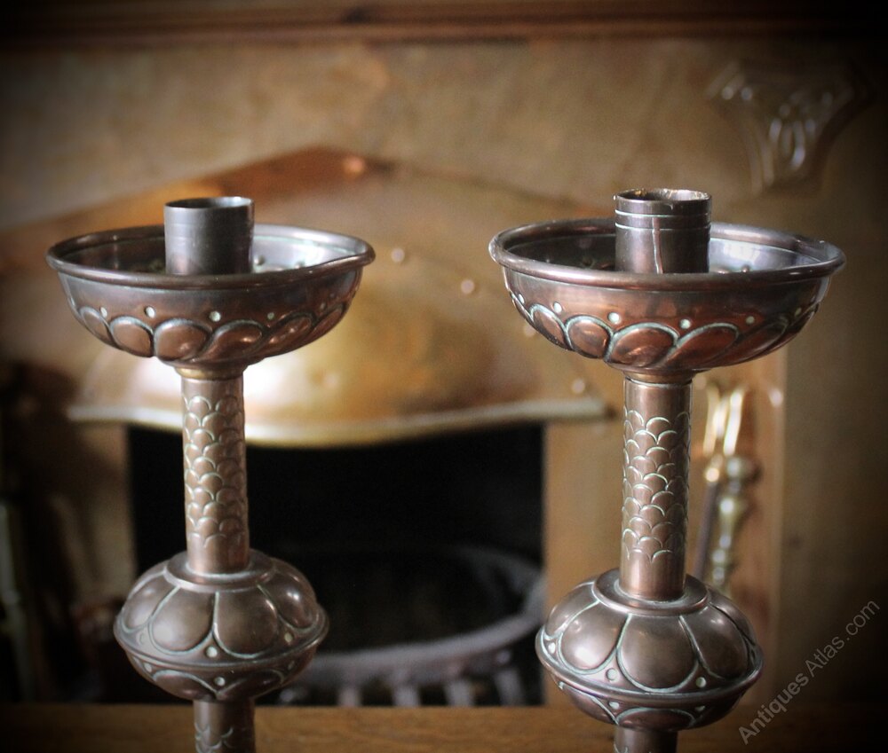 Arts and Crafts pair of copper candlesticks, circa 1900. Measuring 26 cm high x 12 cm diameterDateArts and Crafts :
