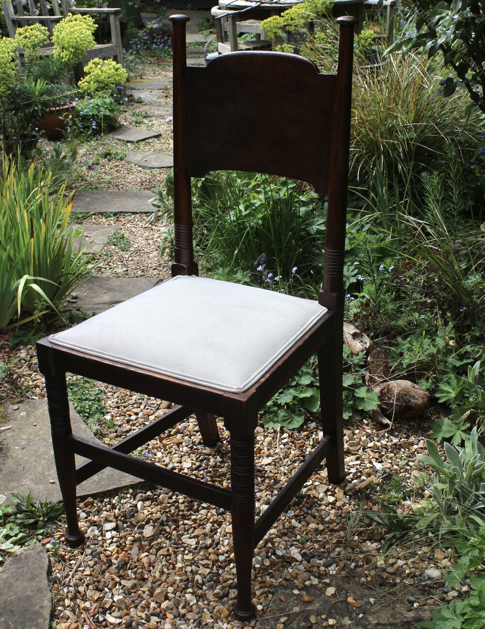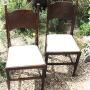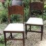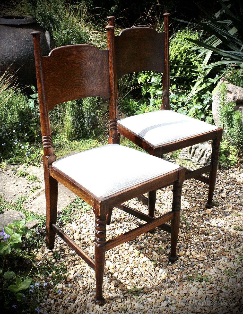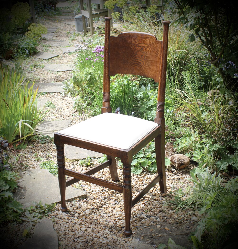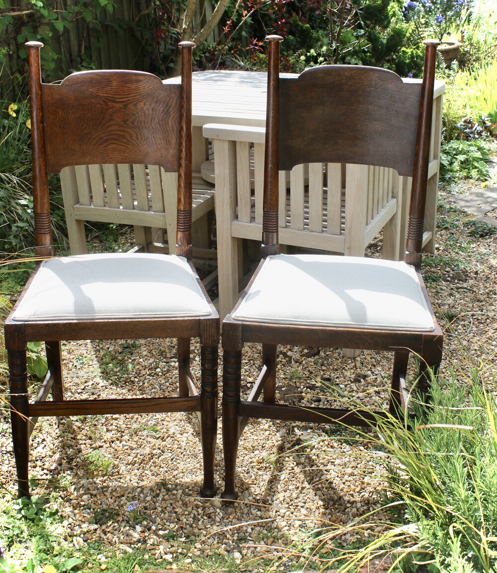A Classic pair of arts and crafts dining chairs made by William Birch of High Wycombe in oak . We have had these reglued, waxed and reupholstered in white linen. Measures 98 cm high x 44 cm wide x 41 cm deepDateArts and Crafts :
