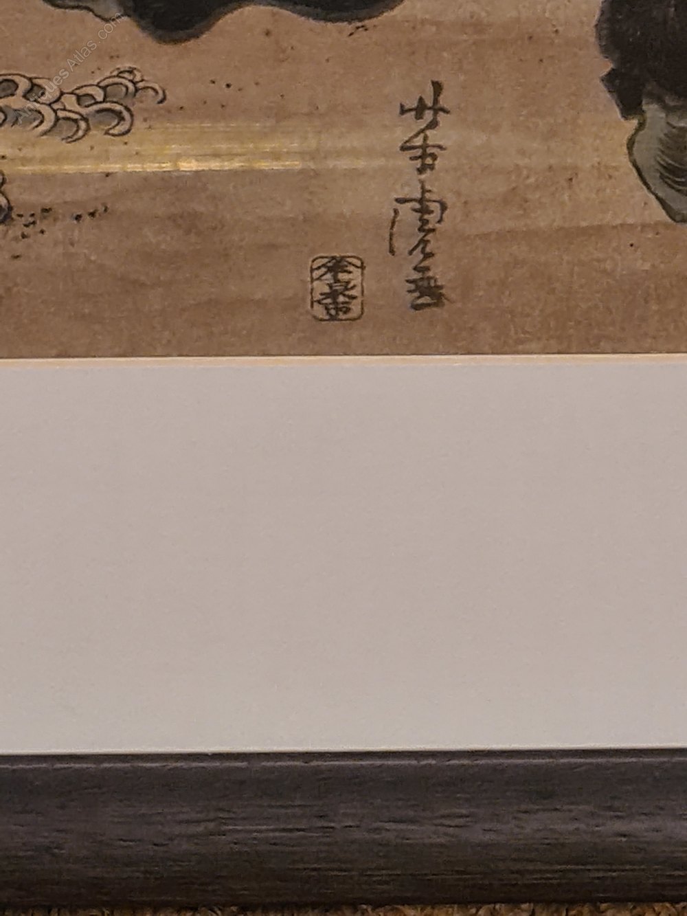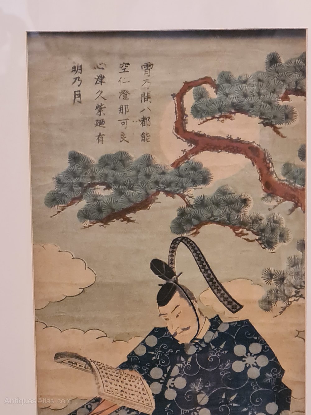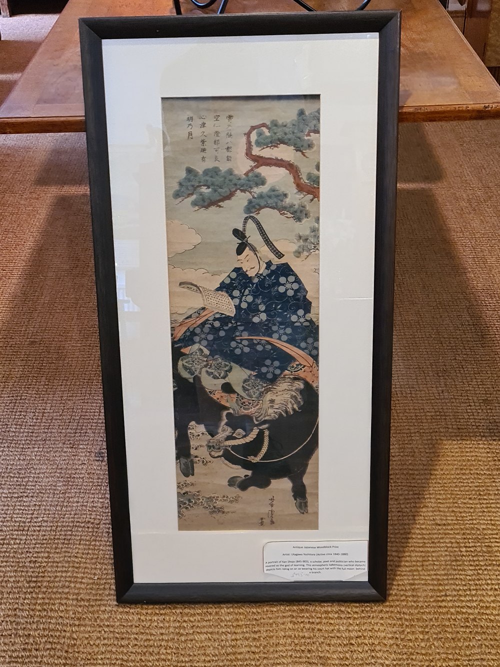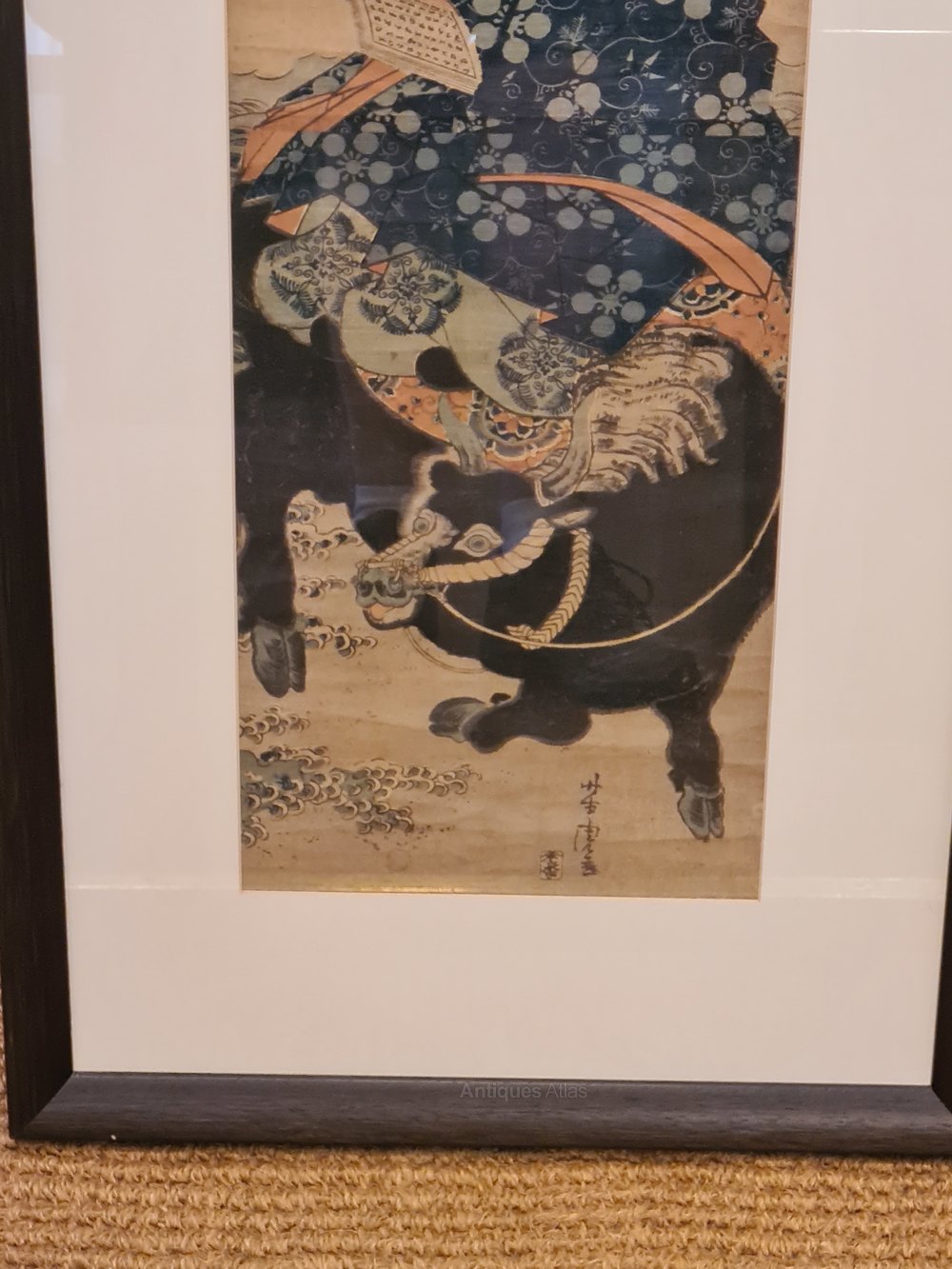 A portrait of Kan Shojo (845-903), a scholar, poet and politician who became revered as the god of learning. This atmospheric kakemono (vertical diptych) depicts him riding on an ox wearing his court hat with the full moon behind a branch. Yoshitora was active circa 1840-1880.DateMid 19th Century
