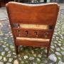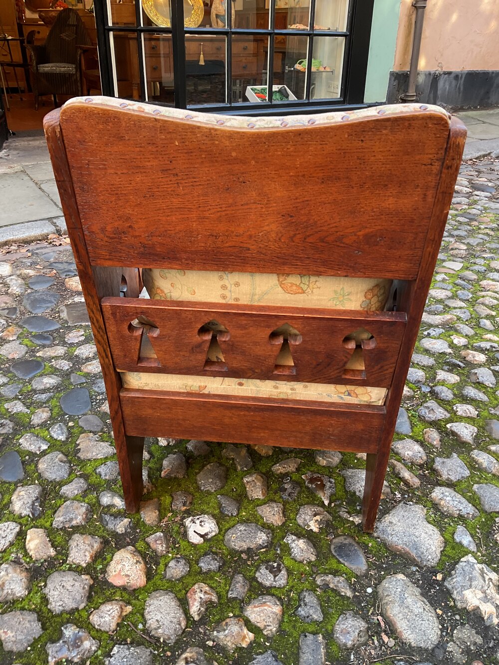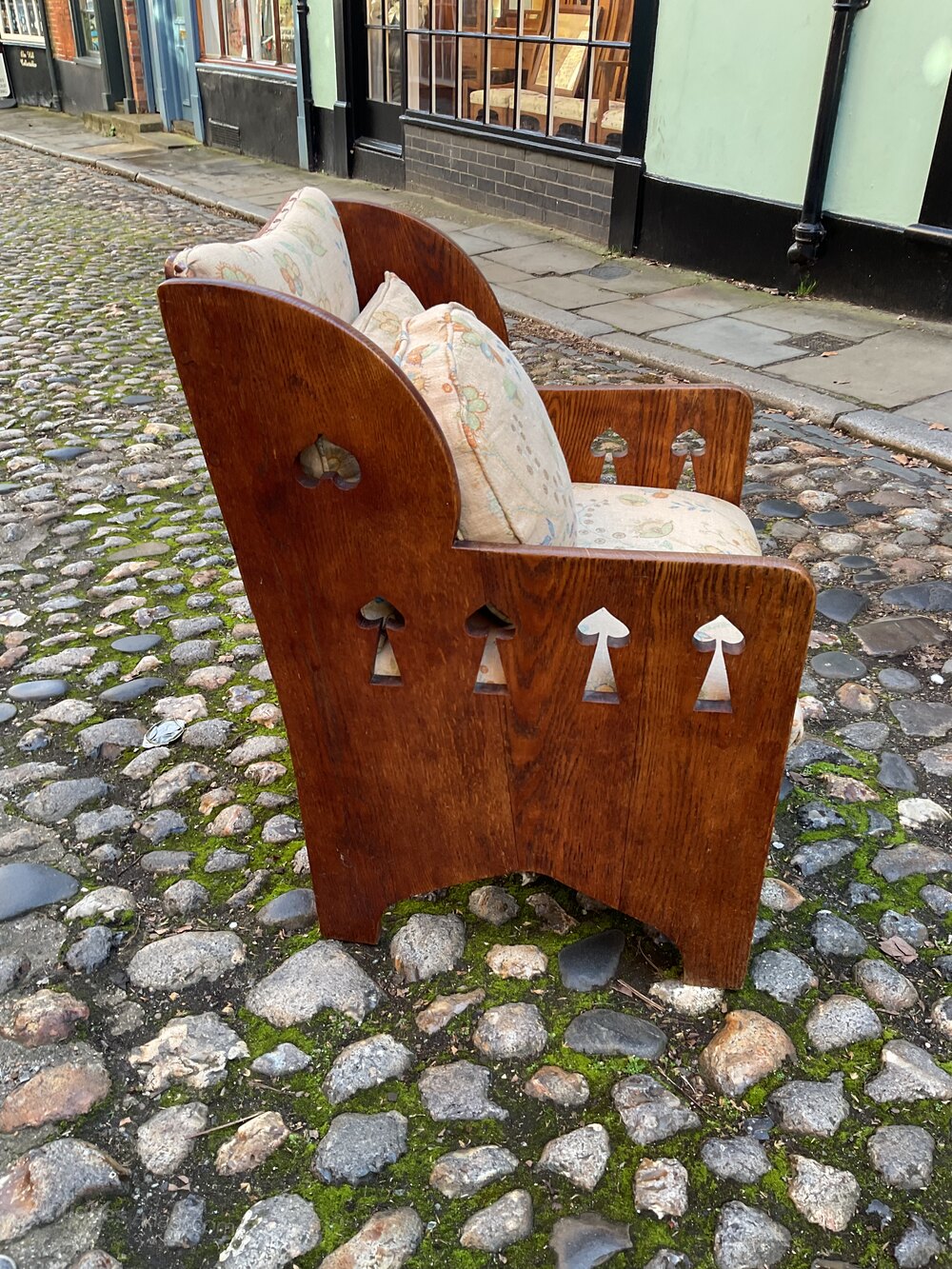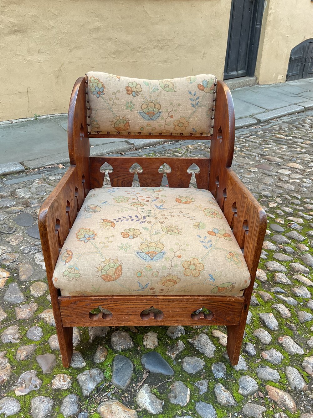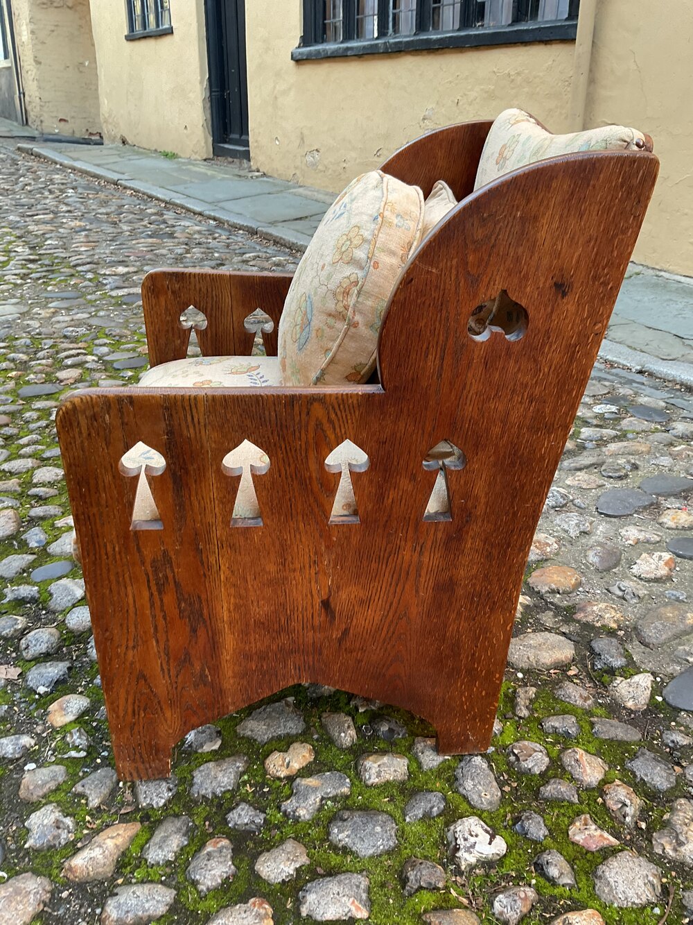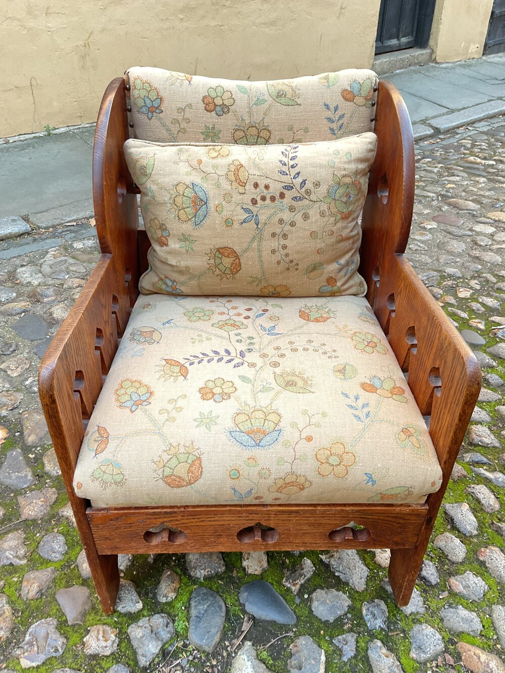 Retailed through the premier London store Goodyers of Regent street.It dates from 1900 and is in good condition. The solid oak chair has recently been recovered in a 1920’s linen fabric and has two extra scatter cushions.