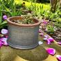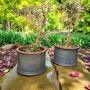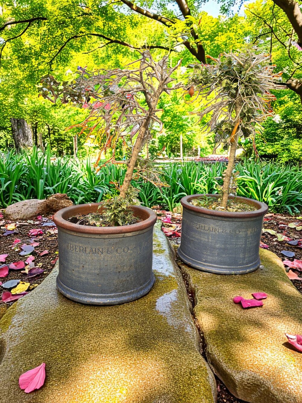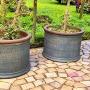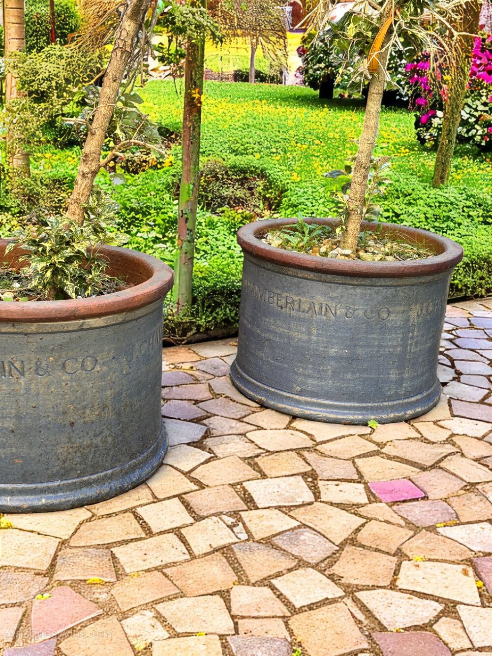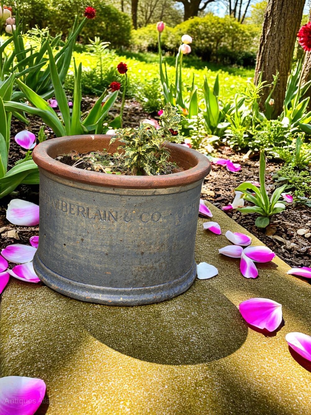 Beautiful matched pair of cylindrical planters bearing the inscription CHAMBERLAIN & CO. Each pot has a dark, slightly weathered surface that gives a classic, antique-inspired look. Both currently contain small trees with healthy green foliage and are ready to display on a terrace, driveway, or lawn. The textured finish and clear branding make these planters a decorative focal point for traditional and contemporary gardens alike.The planters are a substantial size and weight. Approx 38 cms in height and a width of 53 cms