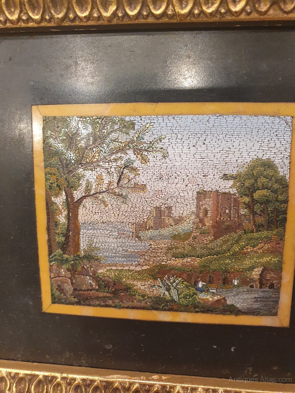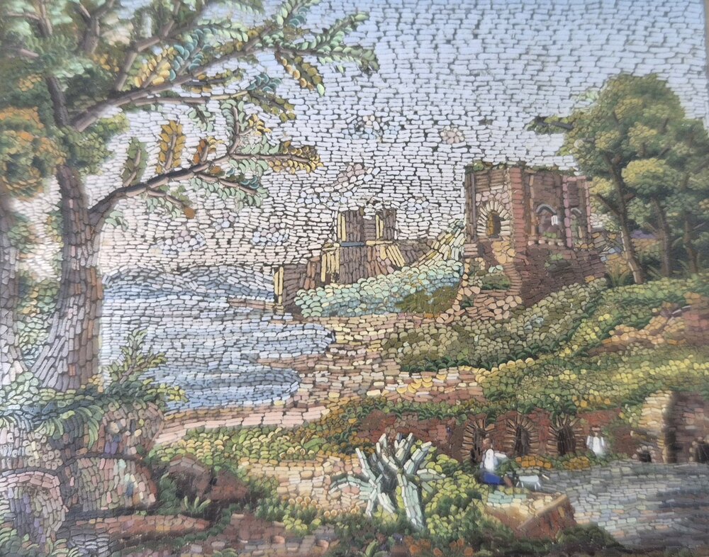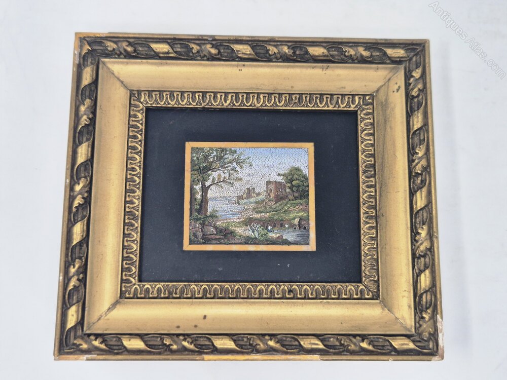 A fine Italian micro-mosaic of a rural scene with two figures fishing by a river estuary. Good condition. Gilt frame with minor wear. .Preferred method of payment is by bank transfer (UK faster payment or to our €Euro account) which incurs no additional costs or charges.