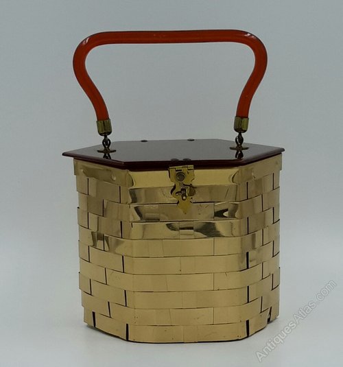 Stunning vintage 1950's hexagonal bag by Dorset Rex. Gold tone metal weave body with a toffee lucite lid and handle.The interior is lined with peach silk and there is a single open pocket. The makers label is sewn in by the pocket. In excellent condition throughout with some very minor surface scratches commensurate with age.Dimensions are approximate