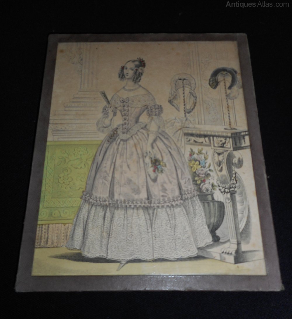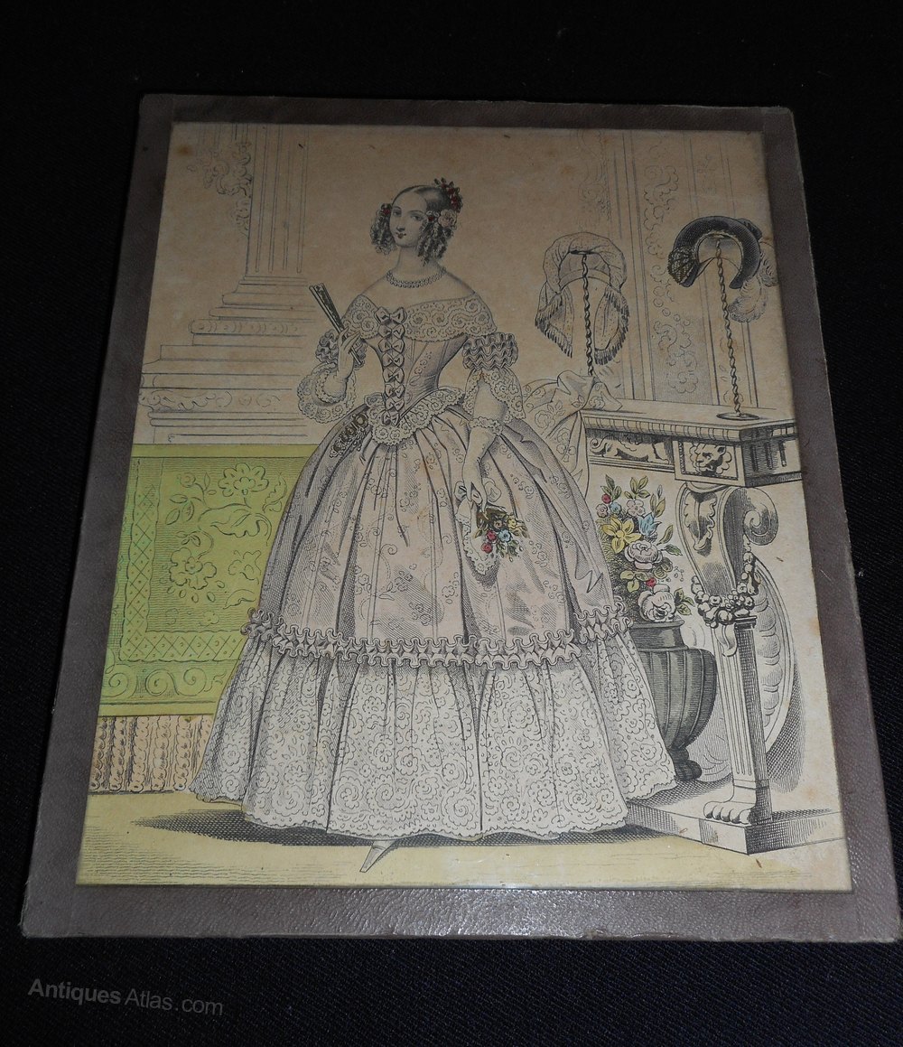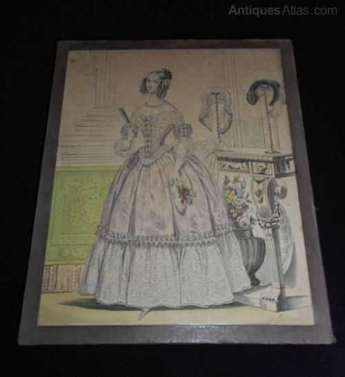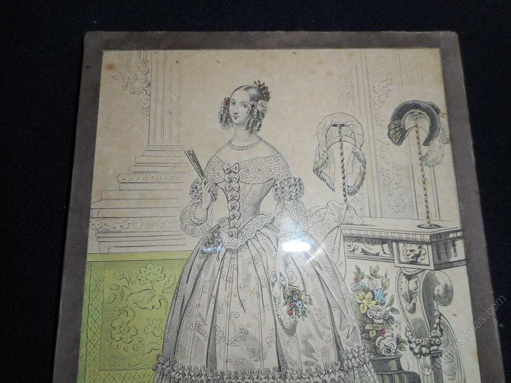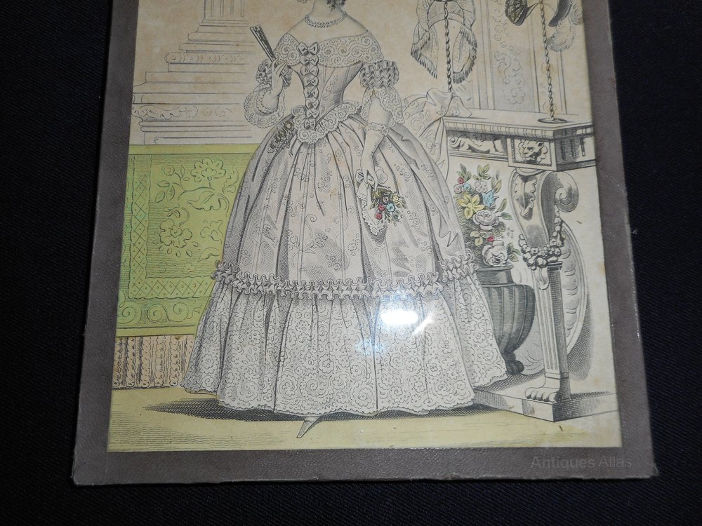Antique French Framed Fashion Print.This coloured print shows a very elegant lady in fashionable dress, her hair is in the typical Victorian ringlets, she is holding a fan in her right hand. The consul table behind her has 2 stands holding bonnets.