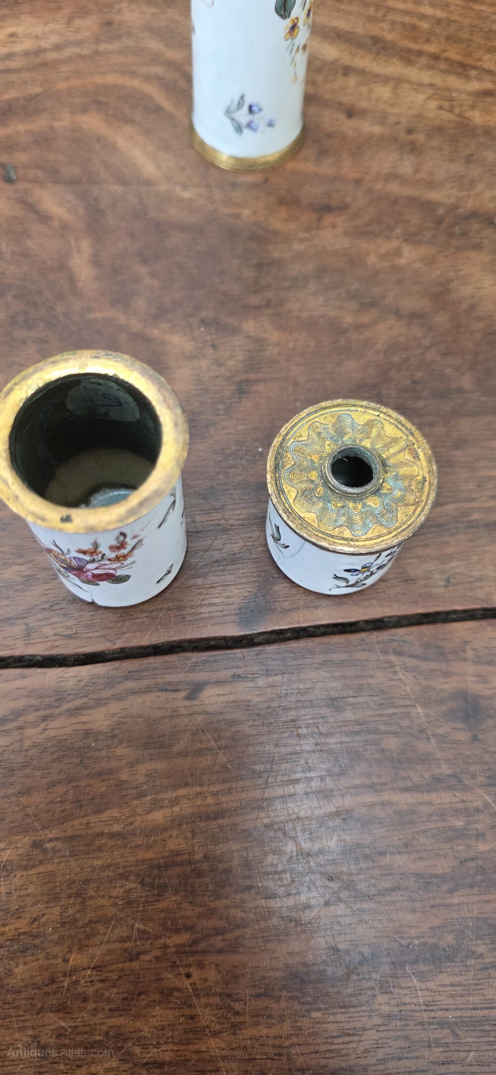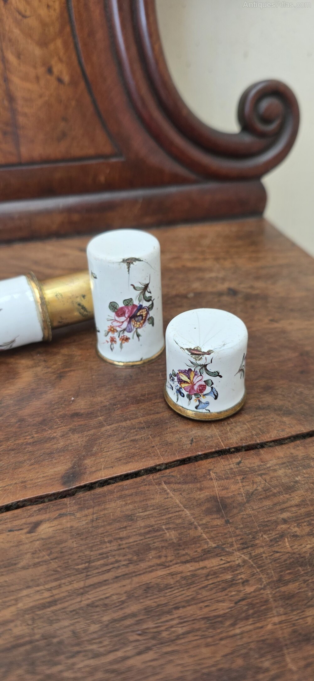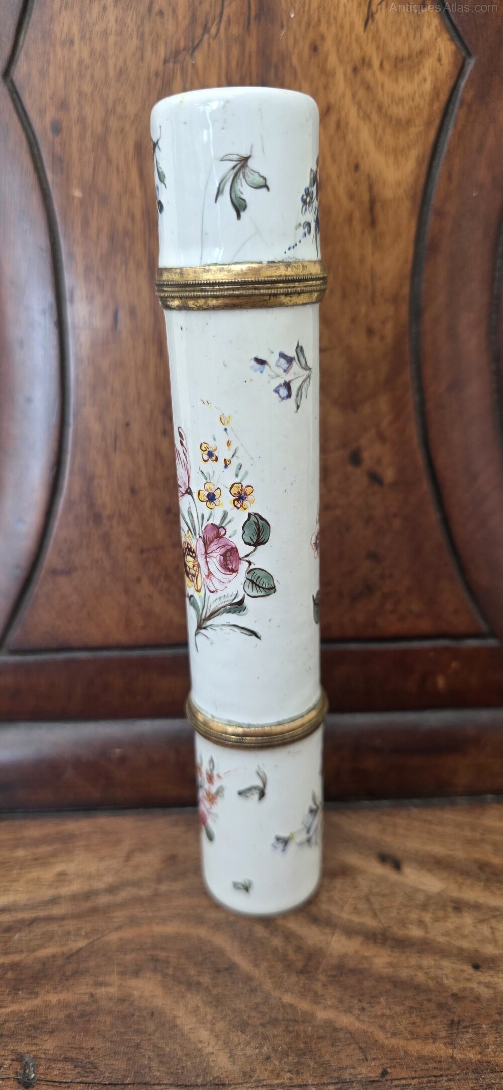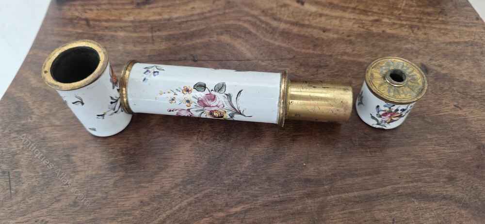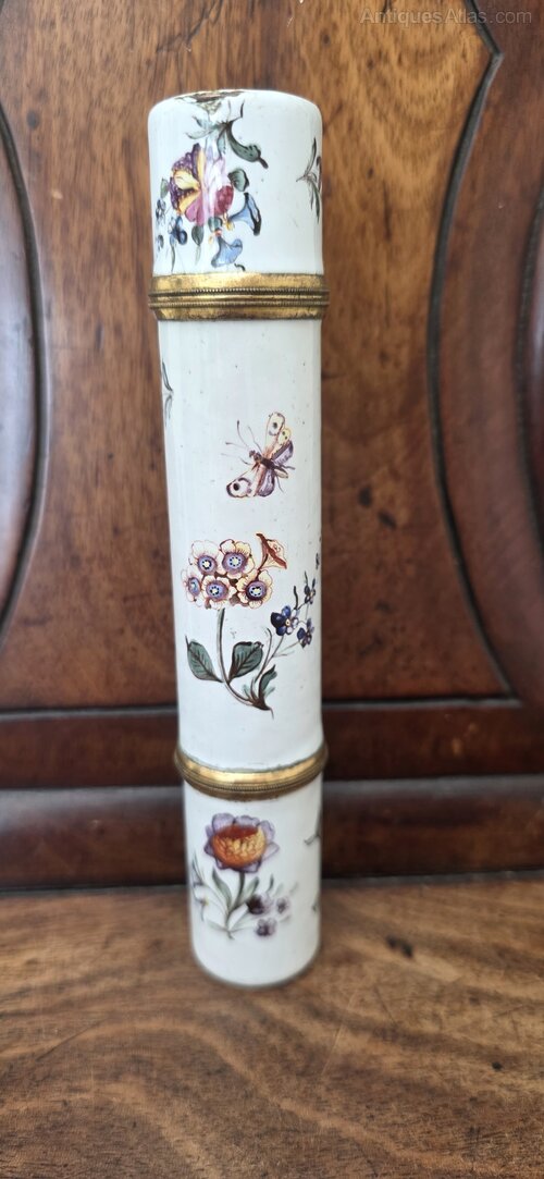 A very rare 17thc Bilston Enamel travelling inkwell and quill / parchment holder. Beautifully decorated with flowers and butterflies. One end unscrews to reveal an inkwell, the other pulls off to reveal a hollow section for quills and parchment.Date17th Century :