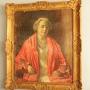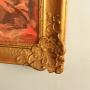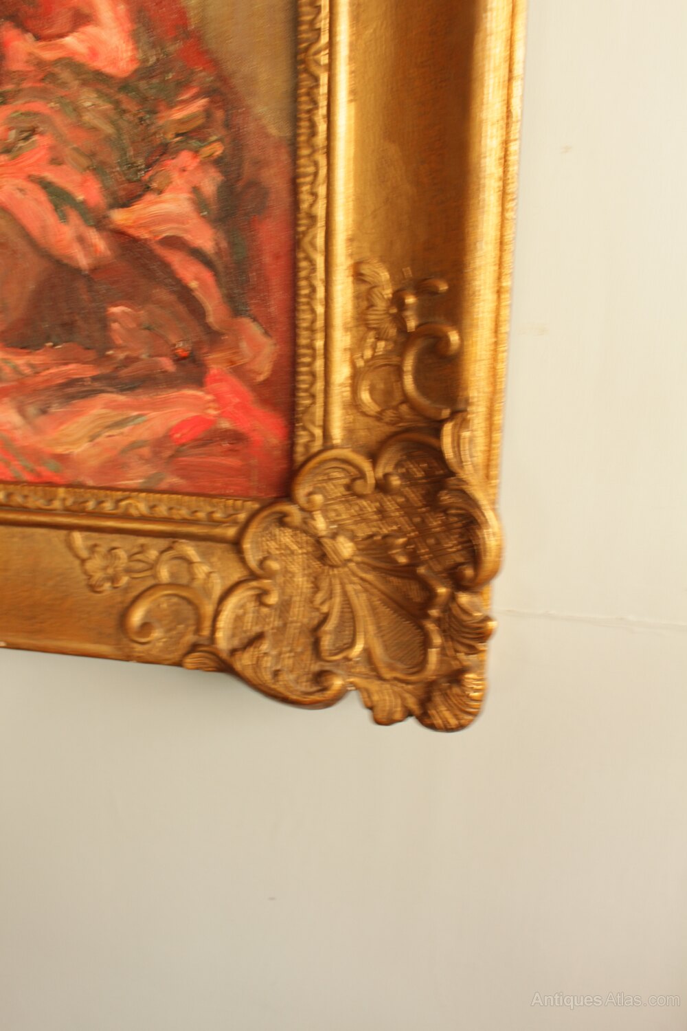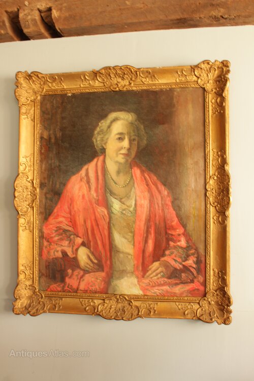 This elegant portait of a lady sitting in a red coat and cream dress, she has a string of pearls, broach on her dress and emerald ring on each hand. The original gilt wooden an plaster frame.It's very much of the period 1930's