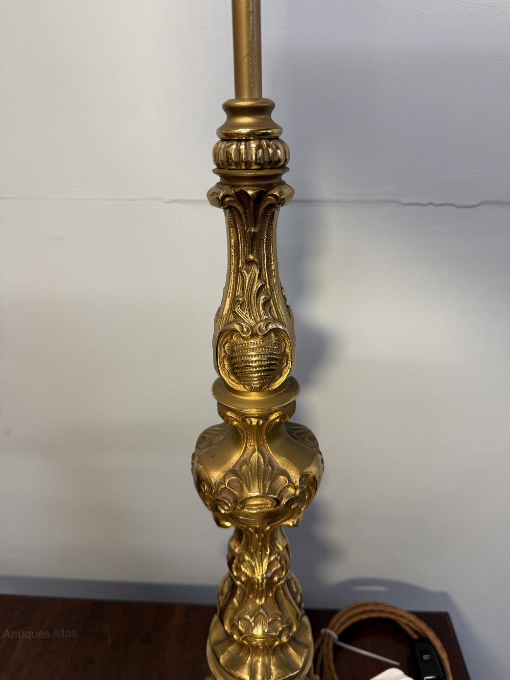 A quality pair of tall cast brass table lamps which have been gilded on the raised part of the brass. The lamps have two bulbs fittings each and come with shades. These lamps have been rewired with cloth covered flex, the on/off switch is on the flex.DateEdwardian
