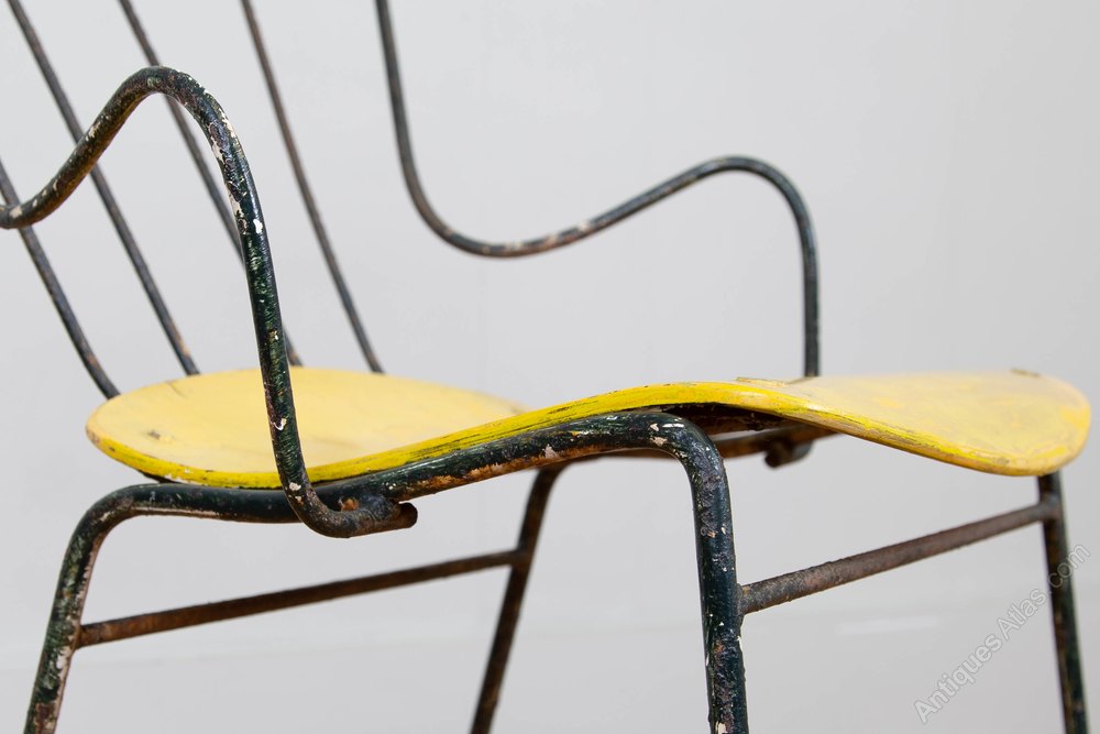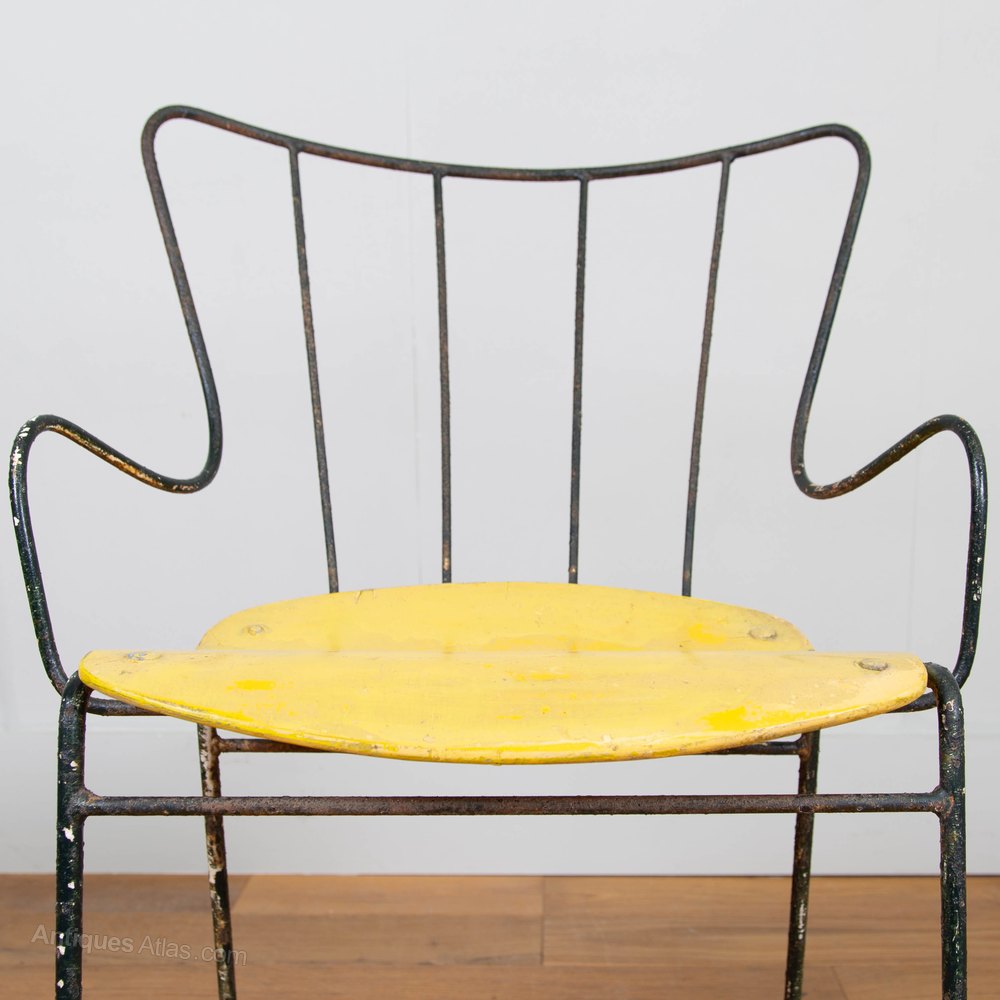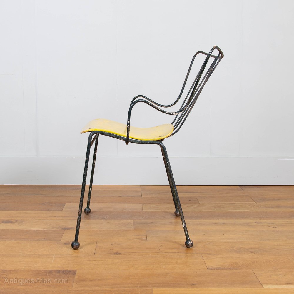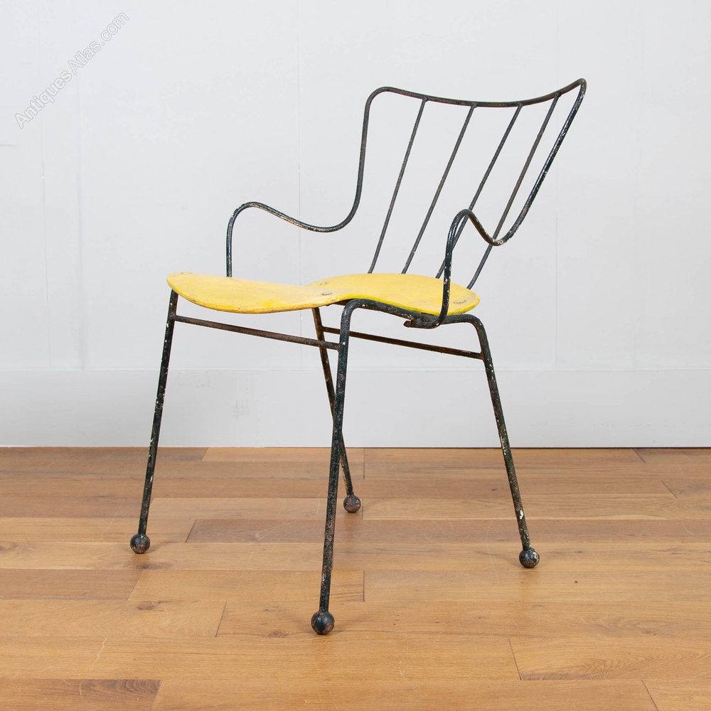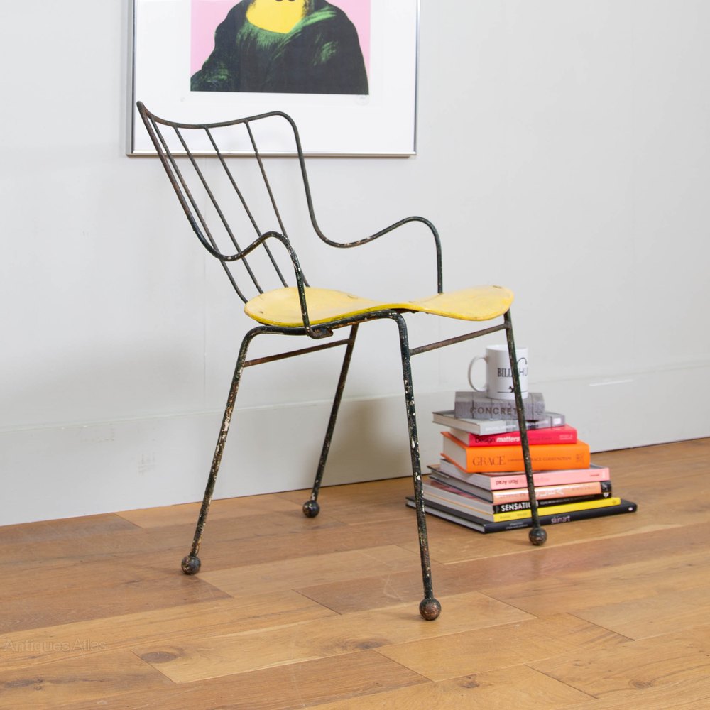 The Antelope chair was designed by Ernest Race in 1951 for the ‘Festival of Britain’. Heralded as the ‘New Elizabethan’ spirit with a sculptural, playful form, the Antelope chair won a silver medal at the Tenth Triennale furniture fair in Milan, making it an internationally recognised icon.This is an early one, with the metal ball feet in situ and surviving in a great unrestored condition. The chair is firm with a sprinkling of dark green paint added, be it a while ago, to the metal frame and a touch up again some time ago on the yellow ply seat.