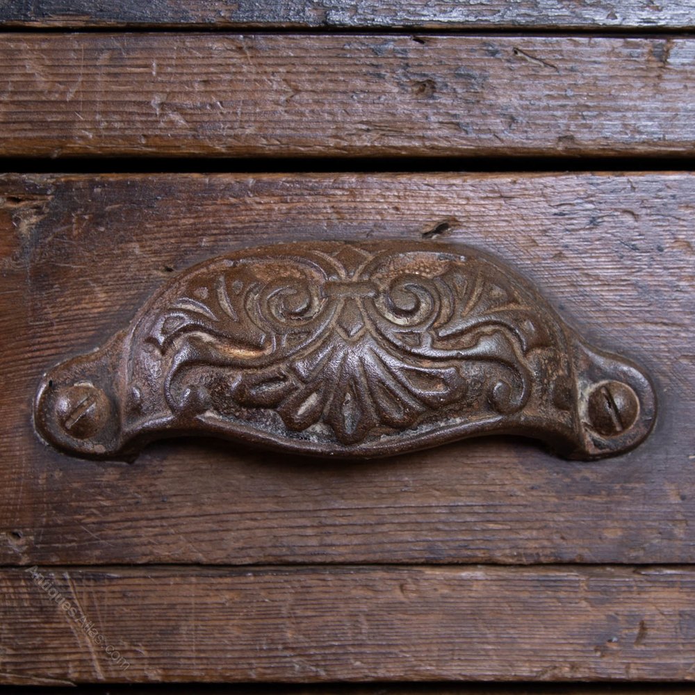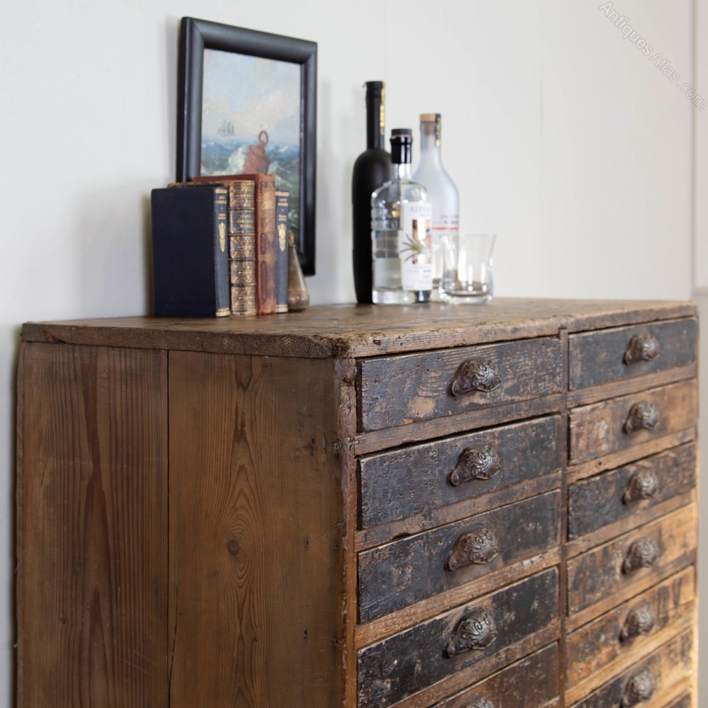 We have carefully cleaned and museum waxed the piece to ensure we capture that look and feel. The drawers are running well and a few have sections in them that could be taken out. The chest sits well and firm with a planked back – again original. Expect around 100 years of workshop wear to the pine frame and 24 drawers. Ready to place and smile over.