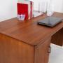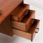 Back to the desk... It’s a weighty piece with a run of 3 drawers to the right and a useful single shelved cupboard to the left which is removable if you desire. The top of solid teak is nicely planed to the edges giving it some real mid-century style, as do those angled legs. As you would expect the desk looks good from all angles so could be placed in a room not just against a wall.