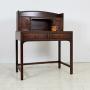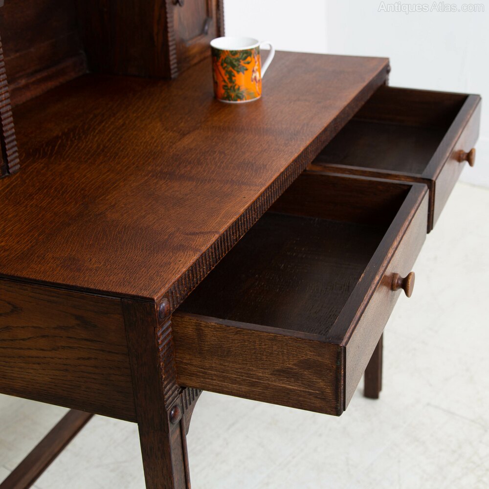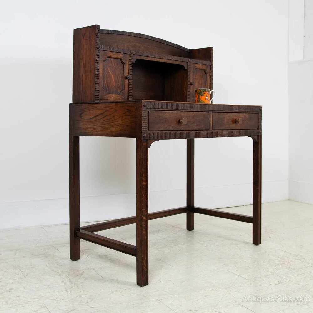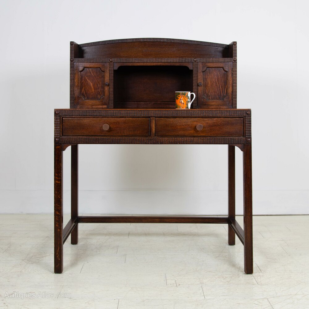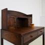 A very handsome looking writing desk in the Arts & Crafts manner C1920 and sitting in fine order. So many things to admire on this one – the little pair of panelled “cupboards” are a delight, the arched back adds a little class, the simple lines to the legs are so good and the smaller proportions than most, make it a real gem of a desk.Condition wise it has been cared for so expect gentle day to day wear but nothing nasty or off putting. The drawers are running smoothly and the little cupboards are closing and opening as they should. Overall lovely mellow aged condition and ready to place and enjoy.