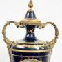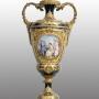 Description: Antique Napoleon III vase in polychrome Sèvres porcelain with gilded bronze inserts, dating to the second half of the 19th century.A monumental ceremonial vase with a lid surmounted by a pine cone-shaped handle, richly decorated with relief motifs and plant details.