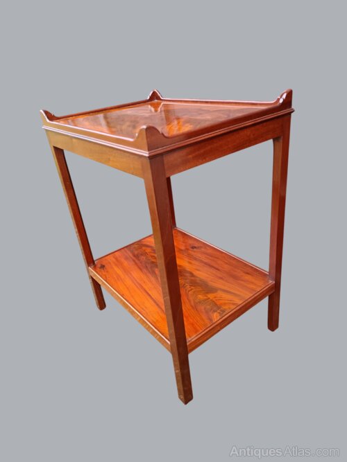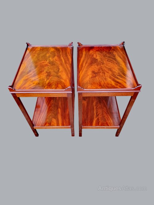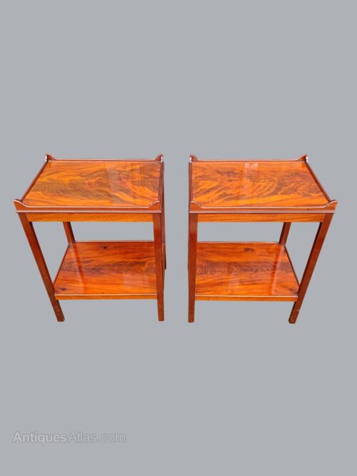 Good quality pair of Georgian style flame mahogany 2 tier lamp tables, the tray style tops raised on square supports with undertier below.DateEarly 20th Century