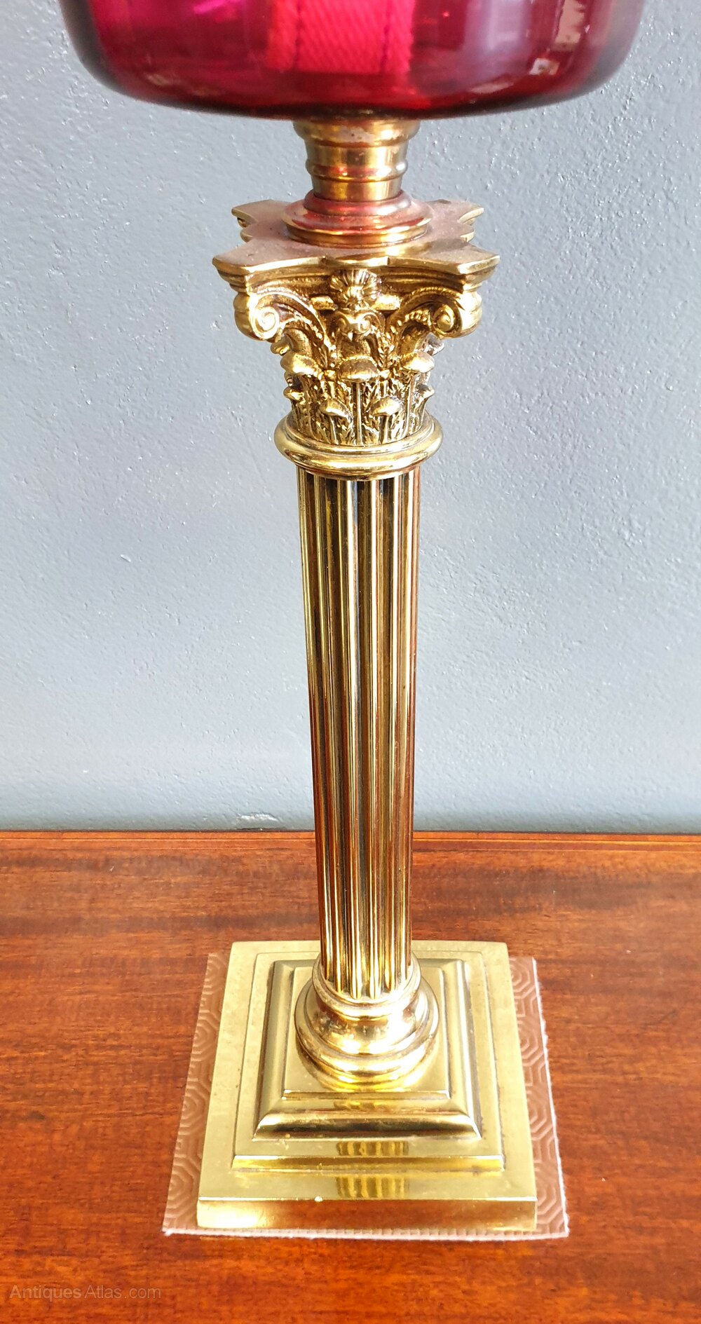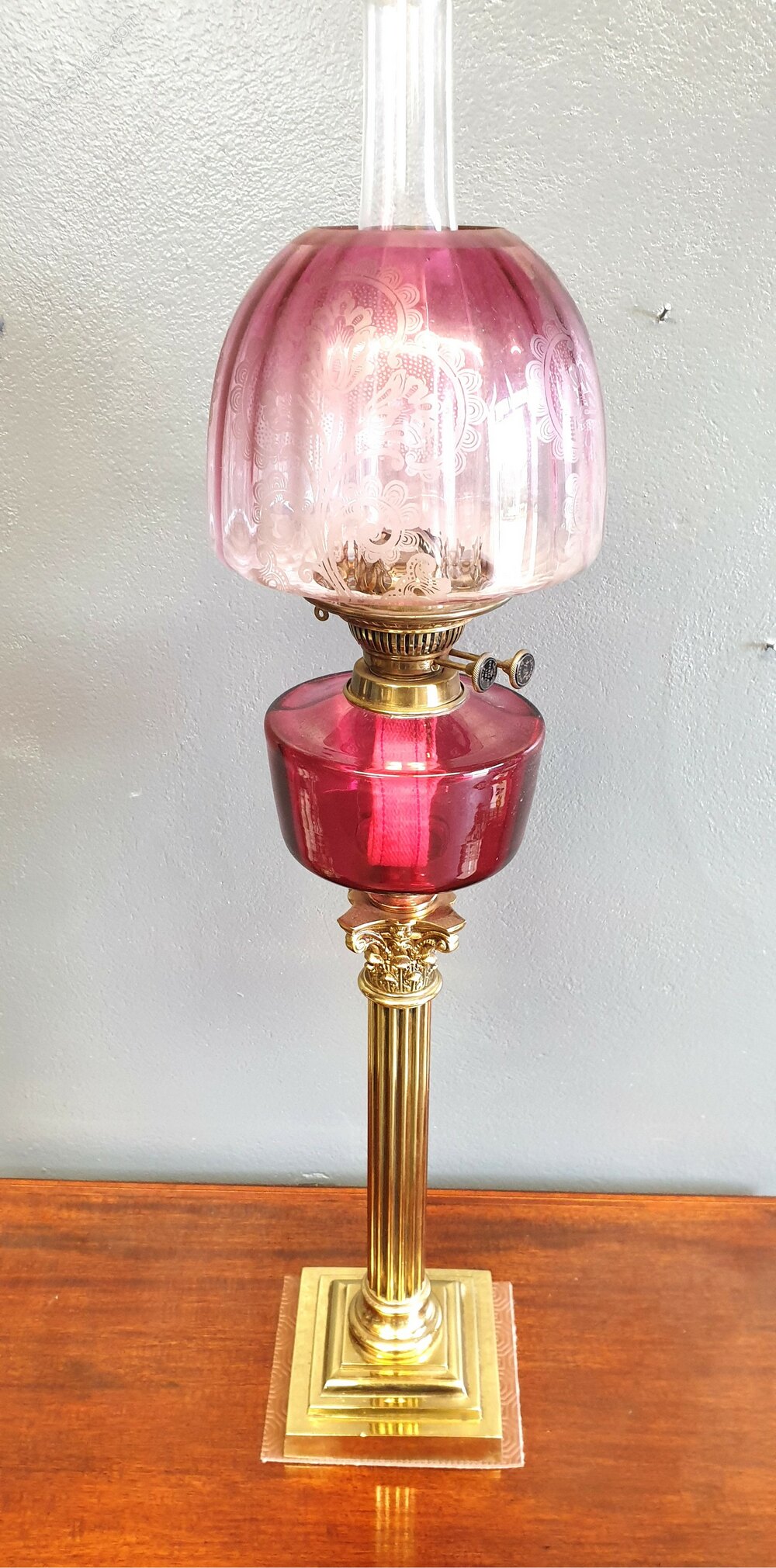 Victorian ruby glass oil lamp having a brass Corinthian column and original ruby acid etched shade.Dimensions are APPROX. 15" High Column 7" Base 32.5" High Overall.