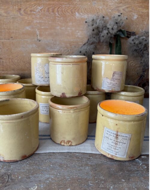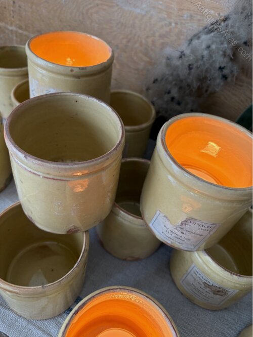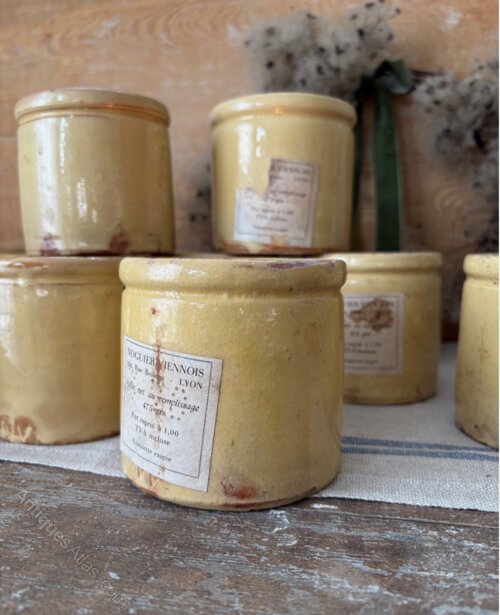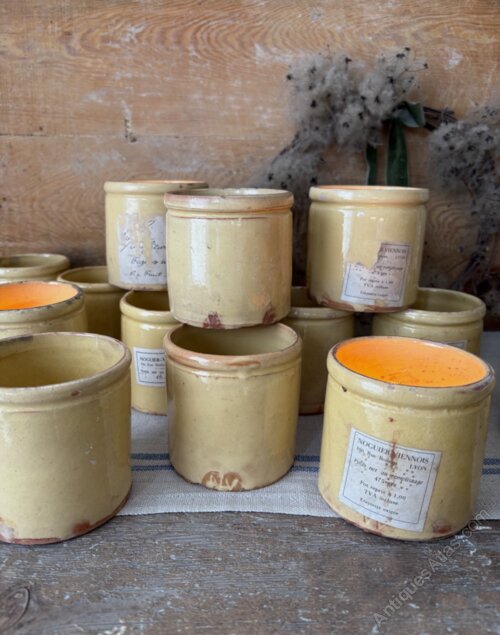 Beautiful glazed ceramic confiture jars, sold individually. A lovely warm butter tone, with wonderfully organic shapes and textures, some with remnants of old paper labels still attached. The handmade nature of these items means they are all uniquely individual, each with their own flaws, and variations to shape and size. Whether used as candle holders for your tablescape, the perfect storage pot for garlic in the kitchen, or toothbrush holder in the bathroom these versatile items that carry elegance and rustic charm.Approx dimensions: Height: 9.5cm, Diameter: 10cm